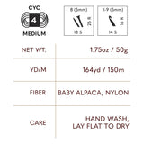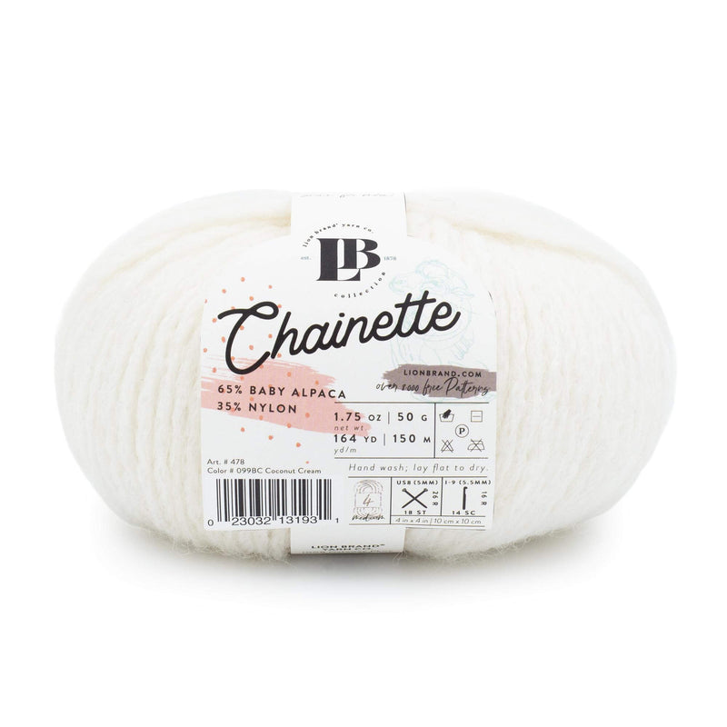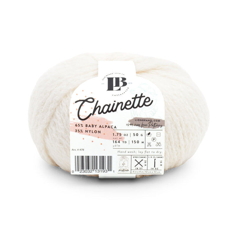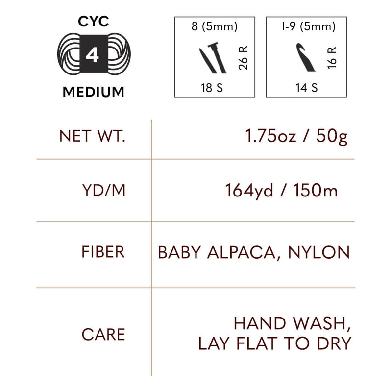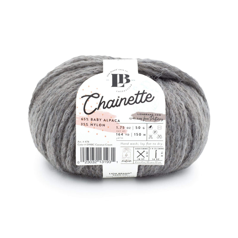 Introducing Chainette, a luxurious blend of 65% baby alpaca and 35% nylon. The chainette construction of this medium-weight yarn adds loft and softness while keeping both knit and crochet projects lightweight. Boasting 164 yards per skein, this yarn is ideal for warm sweaters, soft scarves, and textured accessories. Hand wash only and lay flat to dry to preserve its delicate fibers.