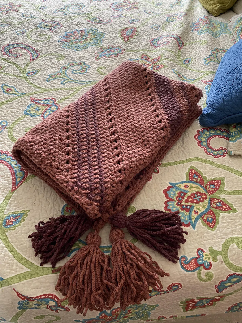 The yarn, the pattern and design together create a harmonious results. If the blanket was only an addition to your decor or my made for someone else will be cherished for many years to come. Picture of work in progress. Completed project.