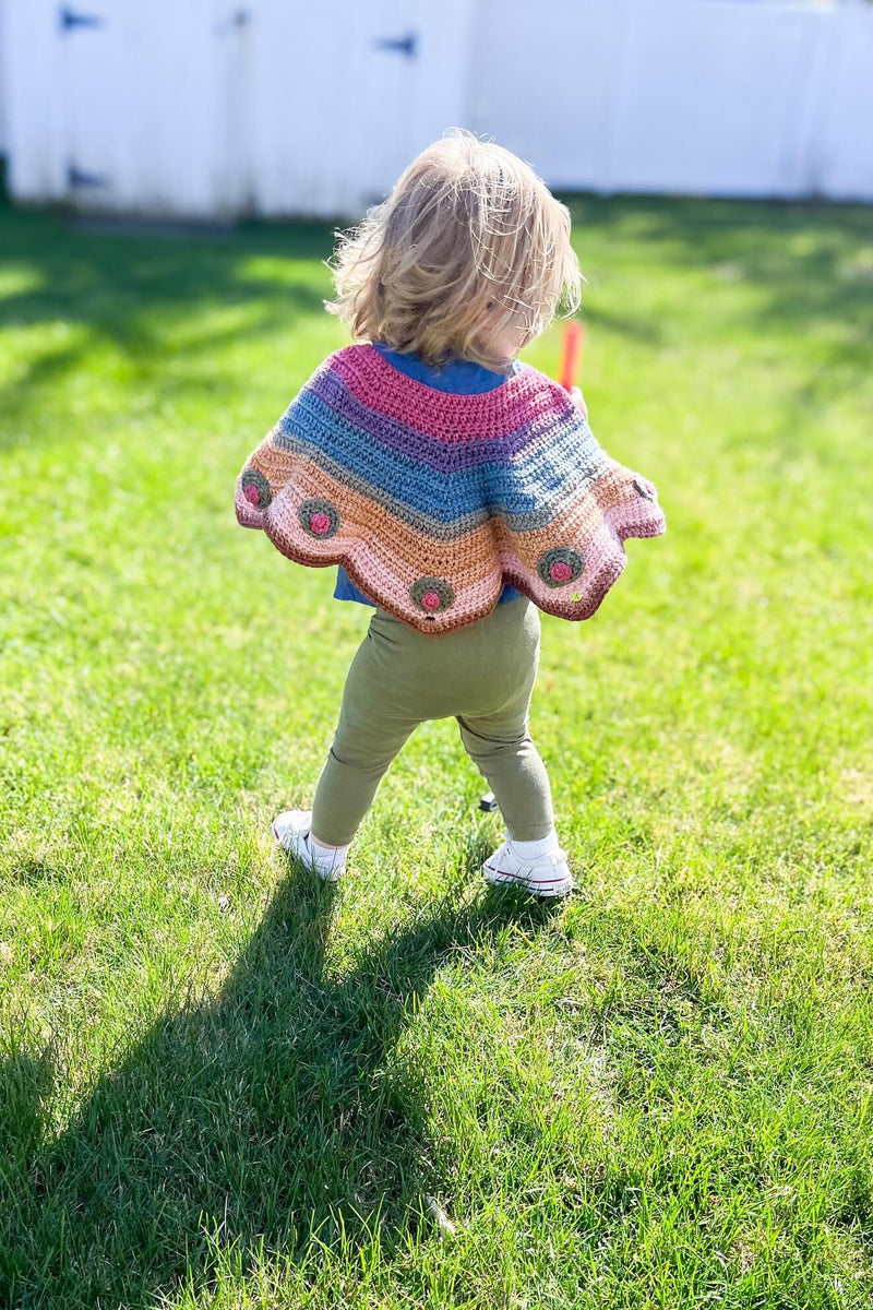 The Butterfly Cape is an intermediate crochet pattern combining the vibrant colors and subtle shimmer of Mandala Sparkle with intricate stitches to form a cape reminiscent of butterfly wings. This cape is perfect for a round of dress-up or to add warmth when there is a chill in the air.