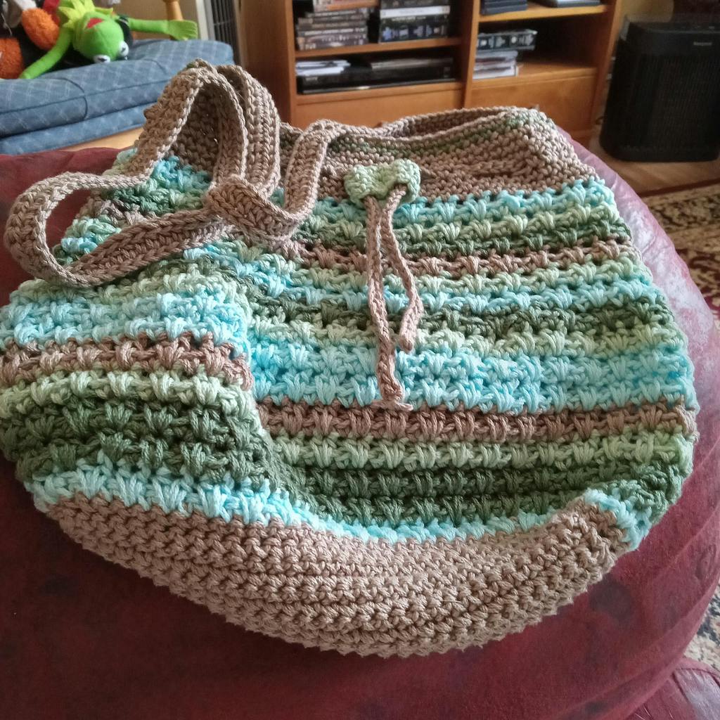The Destination Drawstring Bag will go everywhere with you! It’s crocheted with sturdy, mercerized 24/7 Cotton yarn in a striped design using spike stitches for a beautiful texture. The bag features a crocheted drawstring, cord lock, and crossbody strap.
