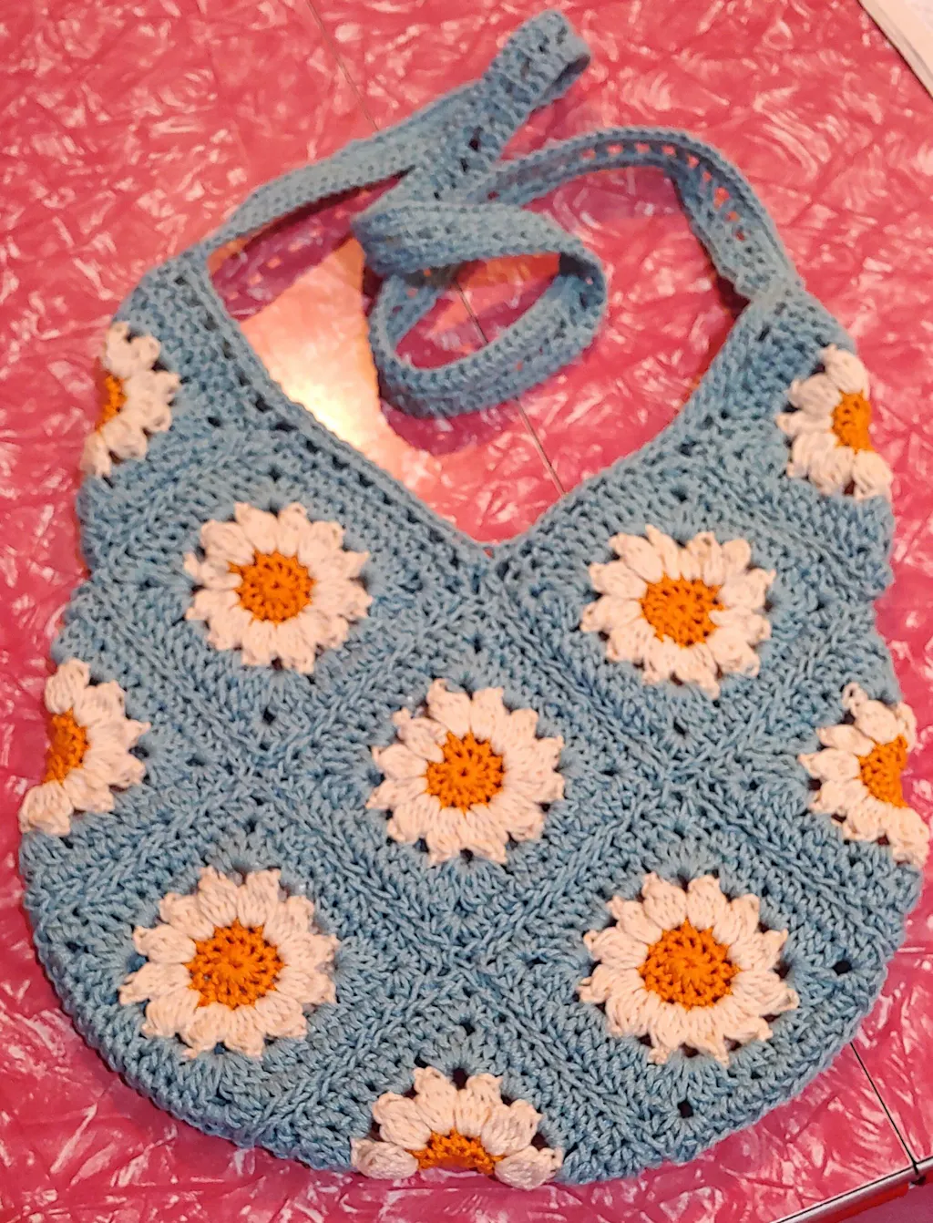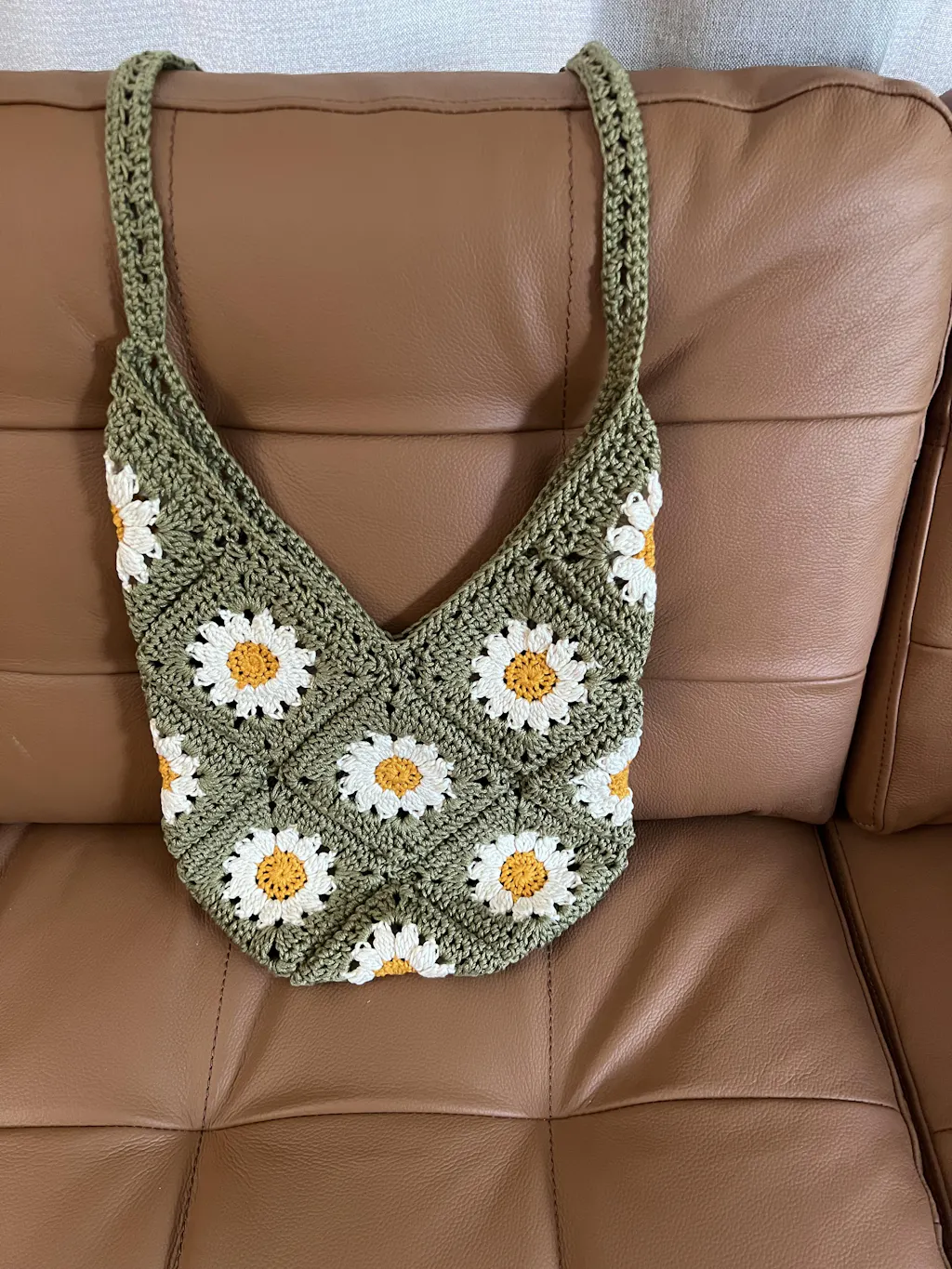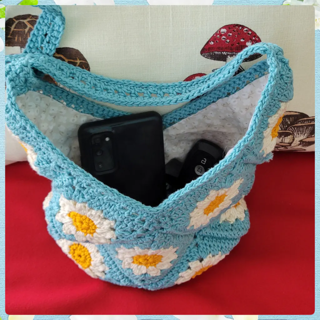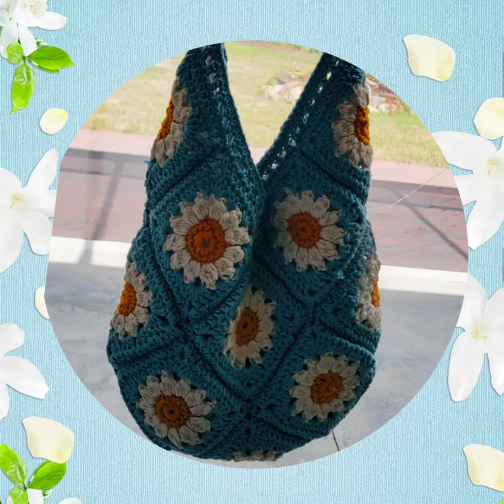 Crochet this bright and cheery shoulder bag that brims with nostalgia! 15 daisy granny squares are seamed together in a clever way to form this beautiful bag!