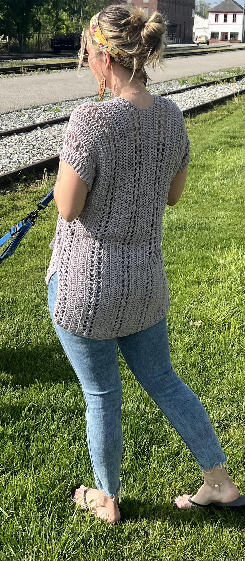 Length- 24.5(25.25, 26.75, 27.5, 29, 29.75, 31.25, 32, 33.5)” (from shoulder seam to bottom hem of back panel)