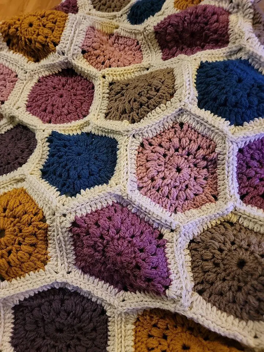 The Tulip Hexagon Throw is made from hexagons featuring the tulip stitch. This pattern includes instructions for two sizes: lapghan and large throw—perfect for any cozy setting!