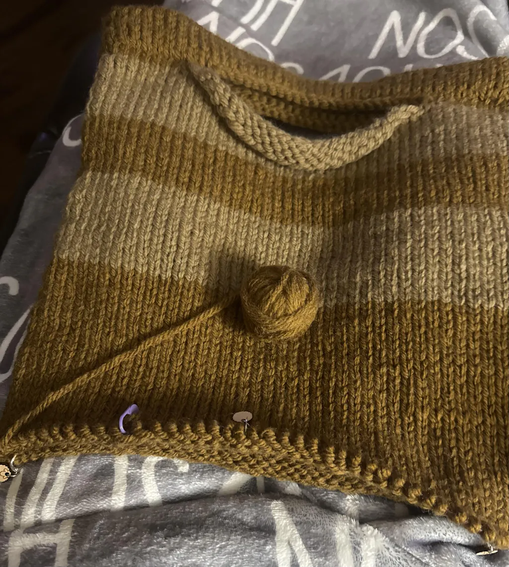This Hue & Me yarn has worked up beautifully. I’m about to bind off and close the bottom of the Folio Tote knit pattern that has been very easy to follow.