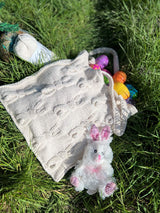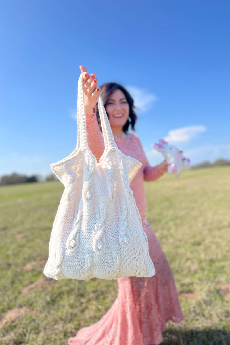 The Bunny Bag is a festive accessory to gather treats at Easter egg hunts or a cute handmade to use in lieu of a basket. A combination of simple knit and purl stitches with some cables create a texture that looks like bunnies. As a standard size tote, it can be used to hold anything you traditionally would need a bag for past the Easter season.
