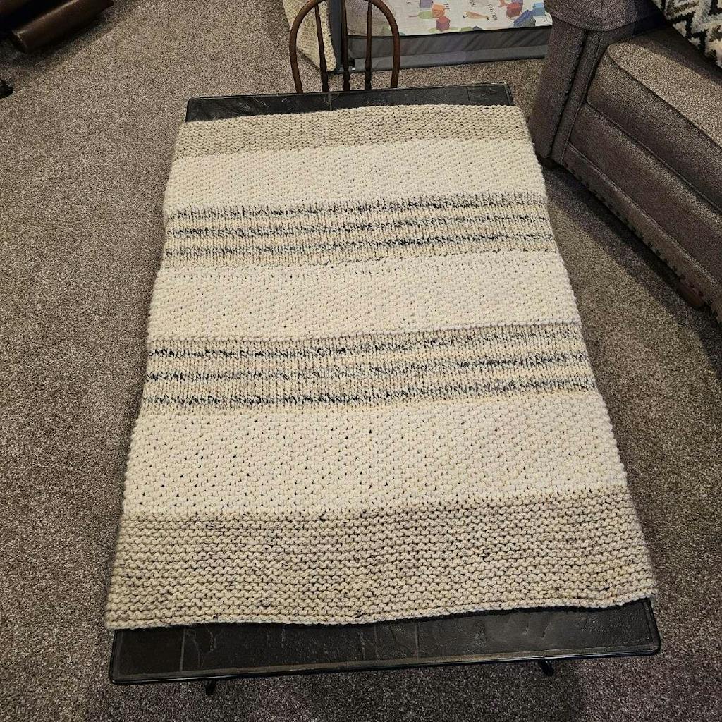 Chunky yarn and simple textures make this winter throw both fun and beautiful! Using three stitch patterns to create lofty textures and interesting striping, you’ll find that this blanket holds your attention yet is easy to make. Understated and timeless, it’s sure to be appreciated in any space, whether modern or traditional. Easy enough for beginners and those just getting back into knitting, yet fun for all!