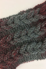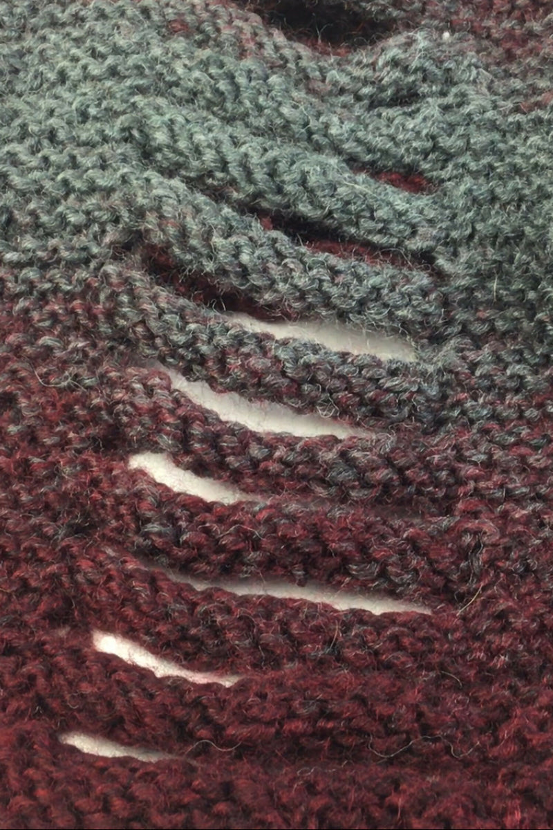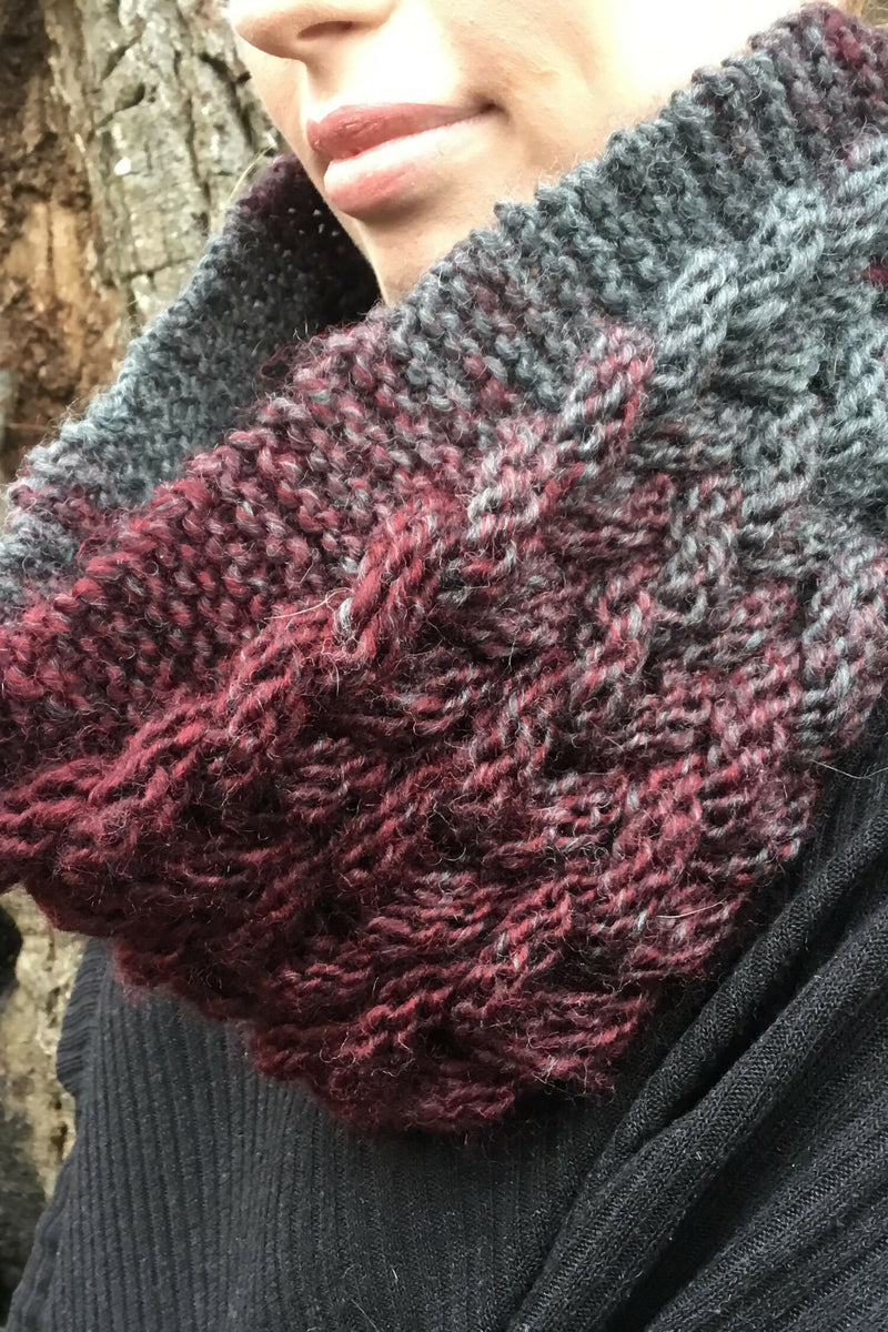 Knit in one piece, in one skein of Lion Brand (r) Scarfie the fabric looks loose and sloppy when you get started, but some clever finger chaining makes a dense yet lightweight fabric that makes perfect use of the slow color change in the yarn. Video tutorial available on YouTube.