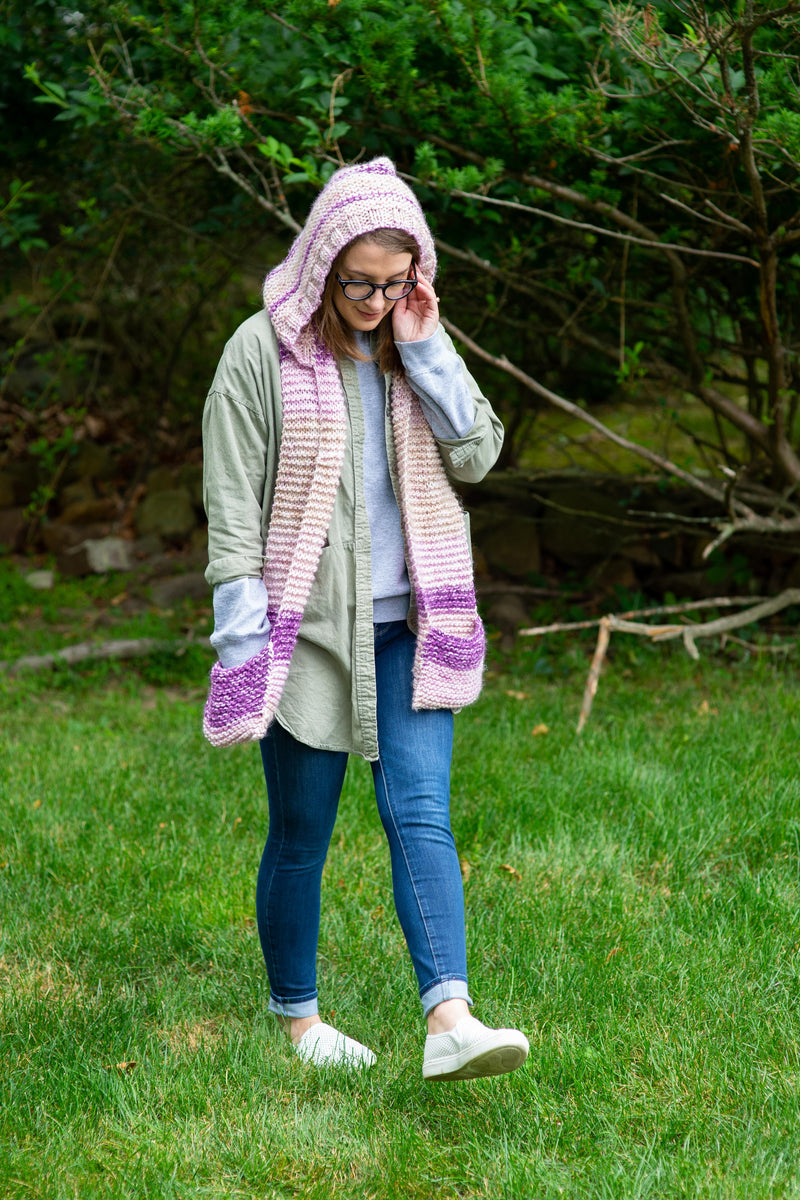 The Afton Hooded Scarf is a knit scarf pattern made with bulky weight yarn that has a skill level of beginner.