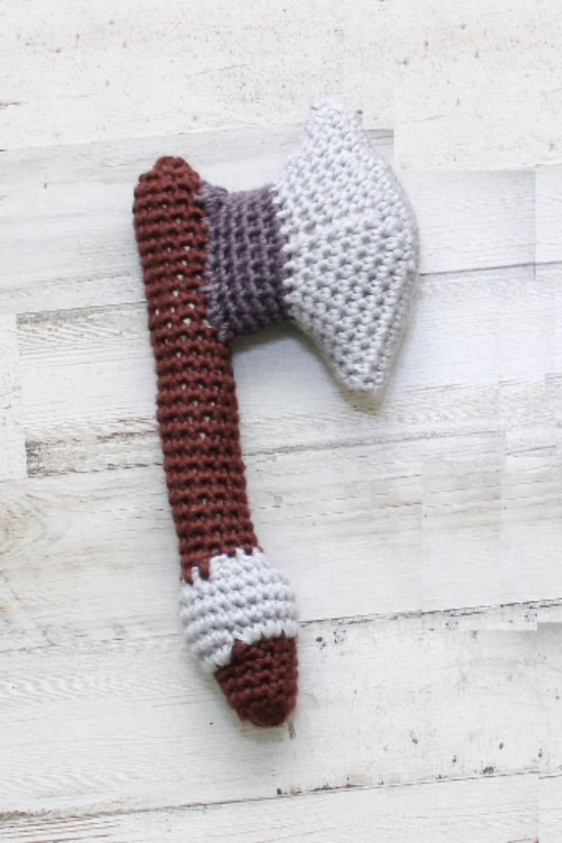 Crochet a baby rattle shaped like a battle axe to complete your little one's first Halloween costume. Also makes a great photography prop for a newborn session or a unique baby shower gift.