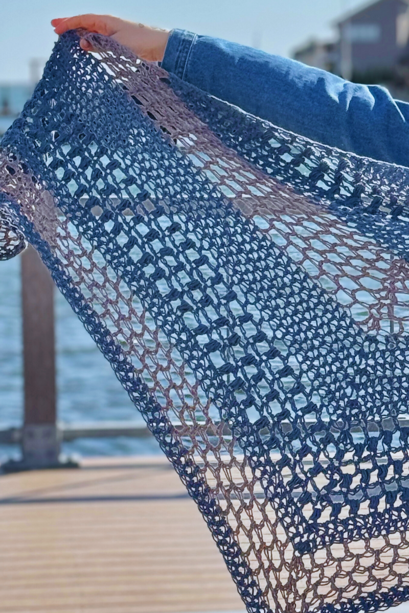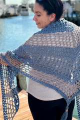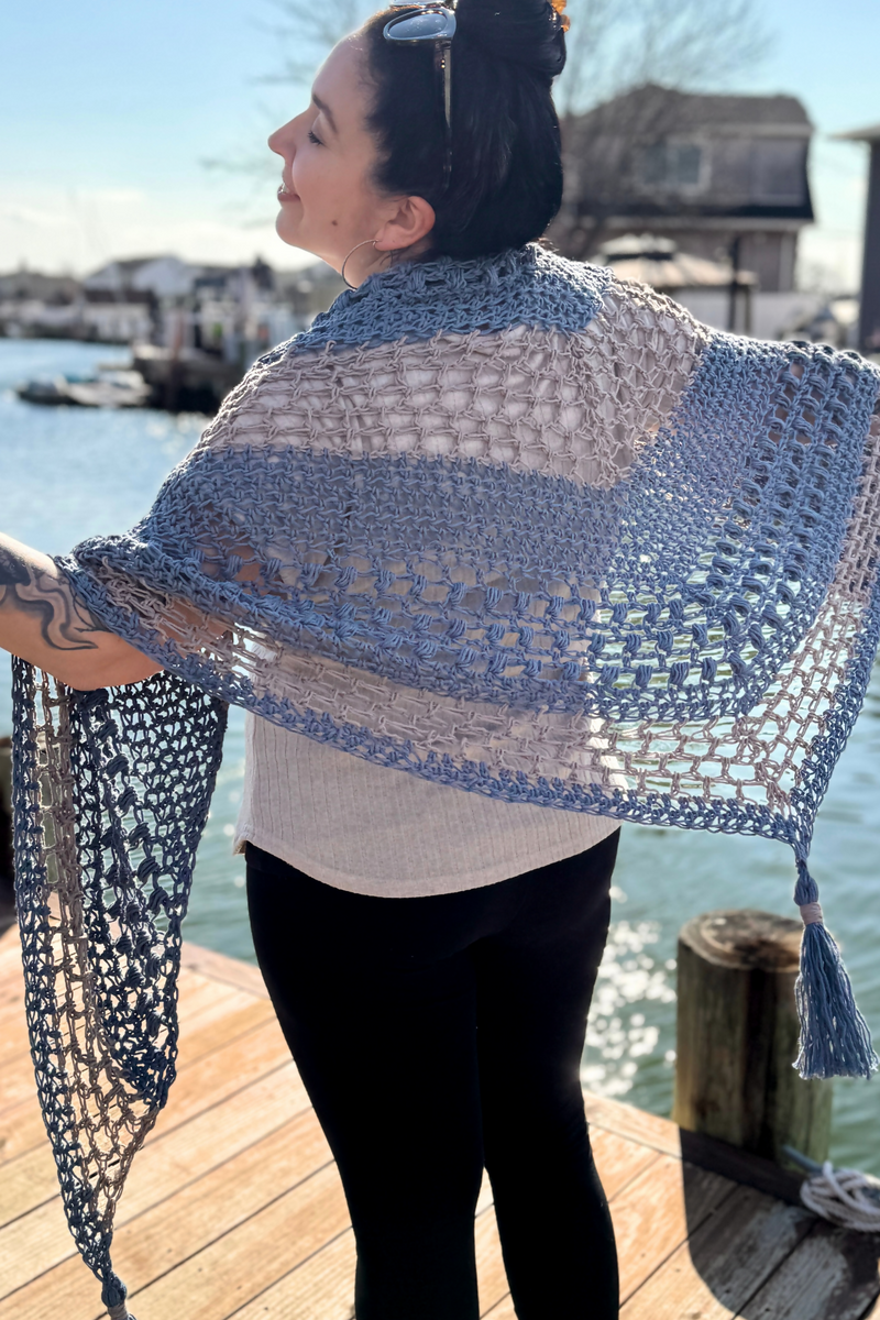 With a loose gauge and only having 42 rows, this shawl works up fast! And its substantial size gives a dramatic effect when worn. I’ve added tassels to the 3 points of the shawl the main color and coordinating color to wrap around the tops of the tassels. This is optional, but it does serve to give extra weight helping to keep the shawl wrapped and hanging down instead of billowing out.