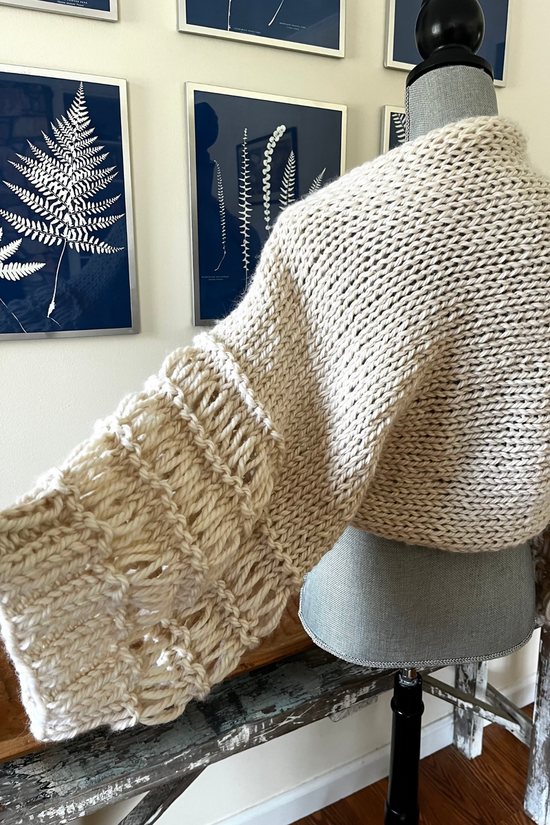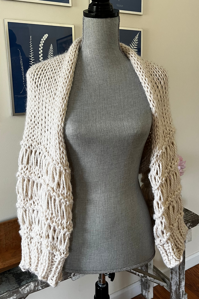 This is not just a bolero, it’s a whole VIBE! It’s a made-to-measure pattern so it’s easy to customize, easy to knit, and easy to wear. Chic and oversized, with instructions to create this piece to your personal measurements, it’s a great layering piece for every season.