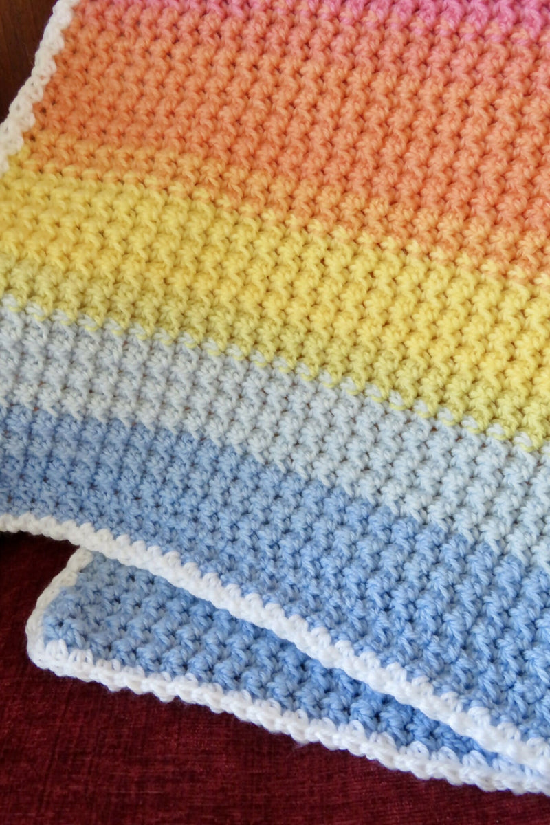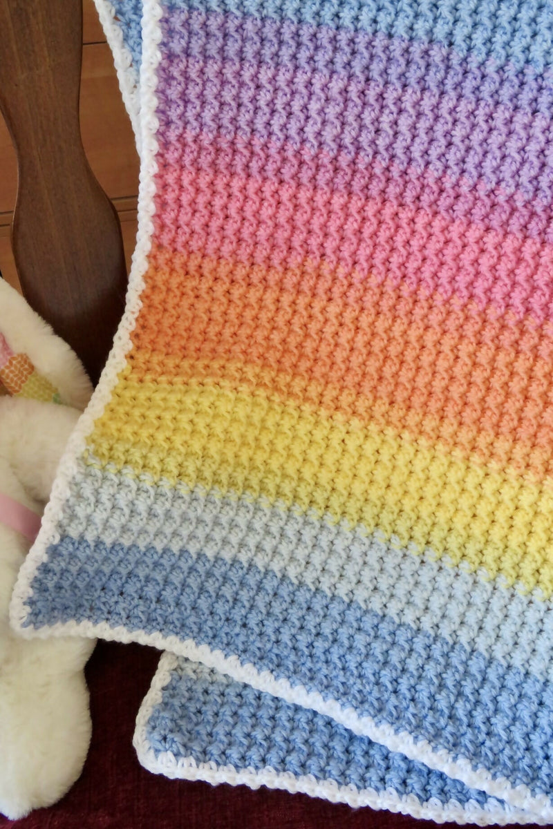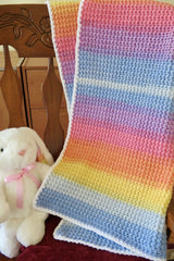 The Mandala Baby yarn creates stunning colorways of blues, yellows, and pinks, resulting in a lightweight and visually captivating blanket. Crocheted with the Trinity stitch—a pattern using single crochet stitches—it may seem tricky at first, but once mastered, it's surprisingly simple to complete. Made with #3 weight yarn, this blanket is both machine washable and dryable. The tightly worked stitches of this easy-to-learn stitch ensure little hands won't get caught in the yarn.