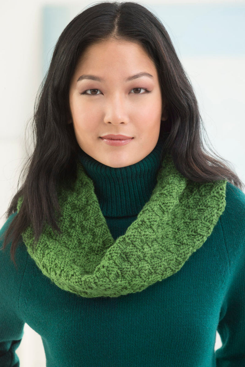 The Blarney Stone Cowl is a knit scarf pattern made with medium weight yarn that has a skill level of beginner.