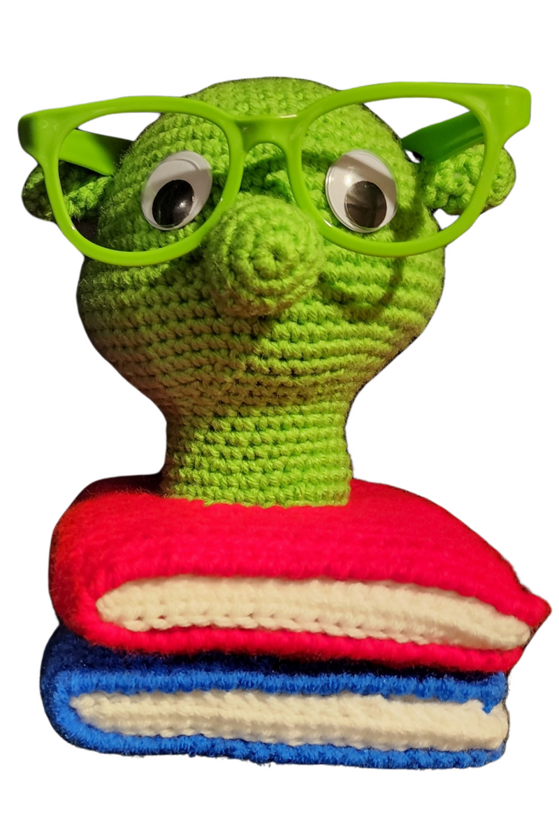It's almost time to go back to school, and what better gift for the teacher than an eyeglass holder. Crochet a bookworm that sits atop two school books to hold the teacher's glasses all day.