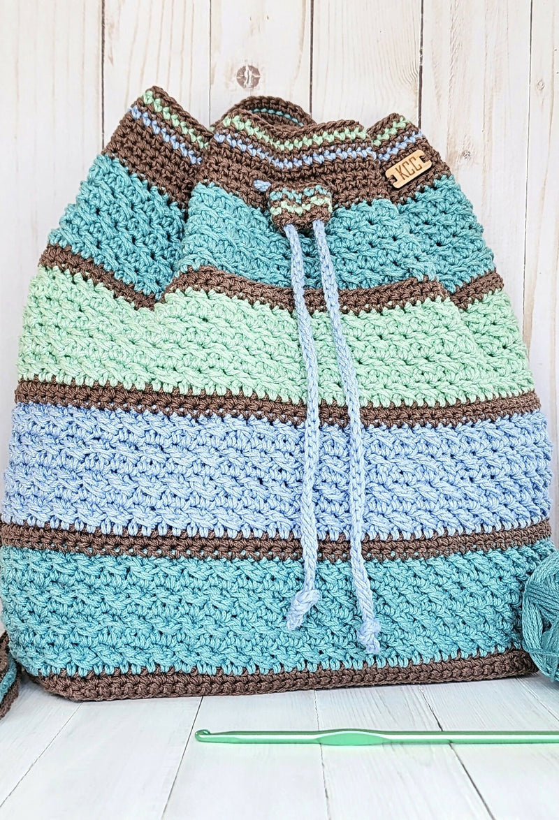 The Color Wave Backpack is a roomy bag for all your spring and summer fun! It’s crocheted with sturdy mercerized cotton yarn in a striped design using angled post stitches for a beautiful texture. The unlined bag features a crocheted front pocket, crocheted drawstring and cord lock, and crocheted straps.