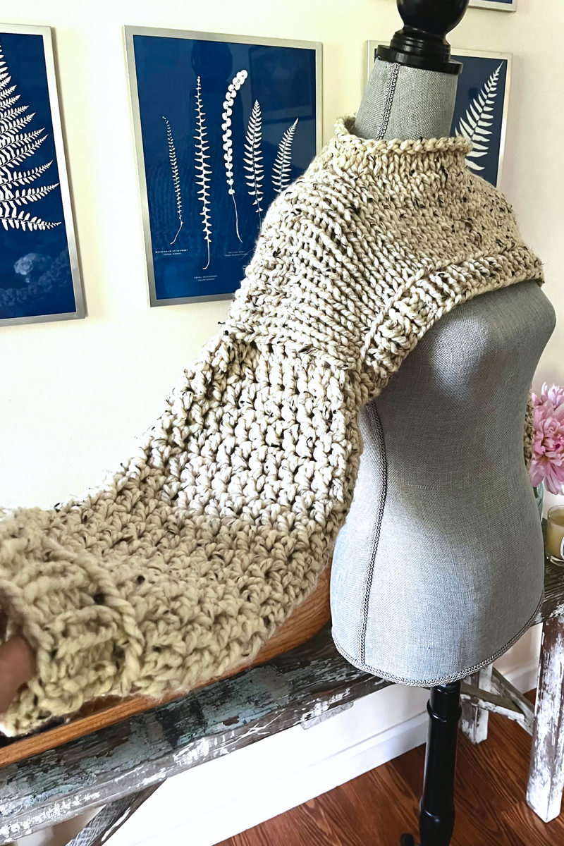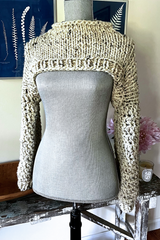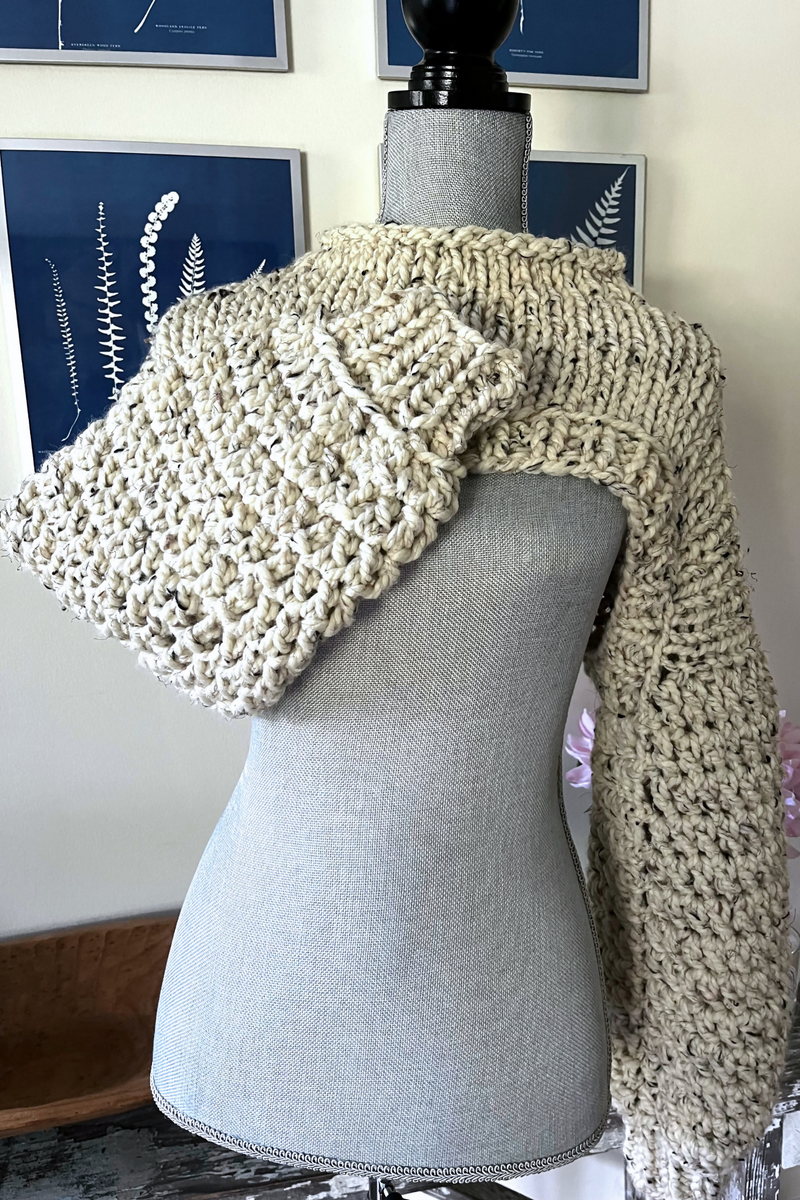 This shrug mixes chunky knitting and crochet for the perfect transitional piece. The short, rolled neck provides effortless, modern style, and the easy ribbed bottom gently hugs the body to keep things cozy. The chunky crocheted sleeves give off all the fall vibes and the ribbed cuffs complete the look.