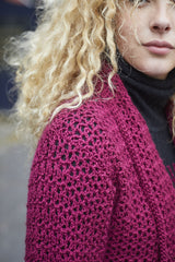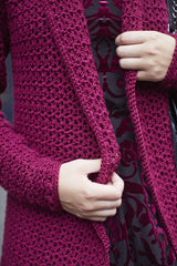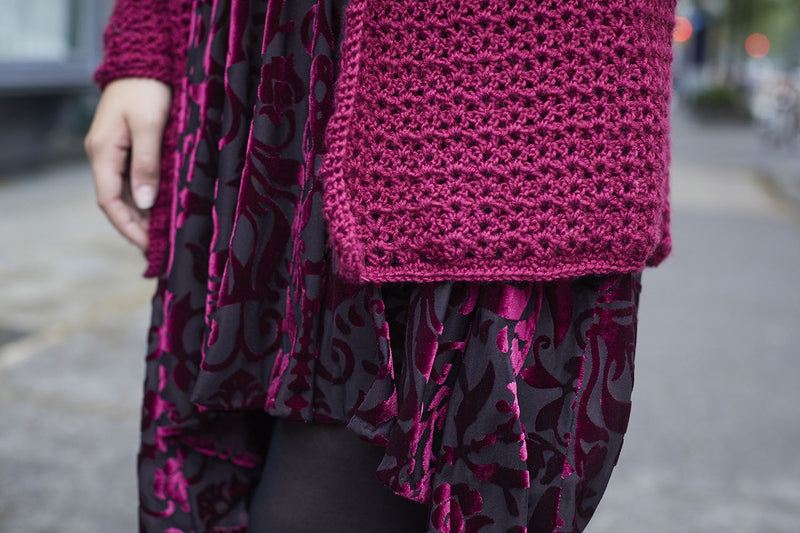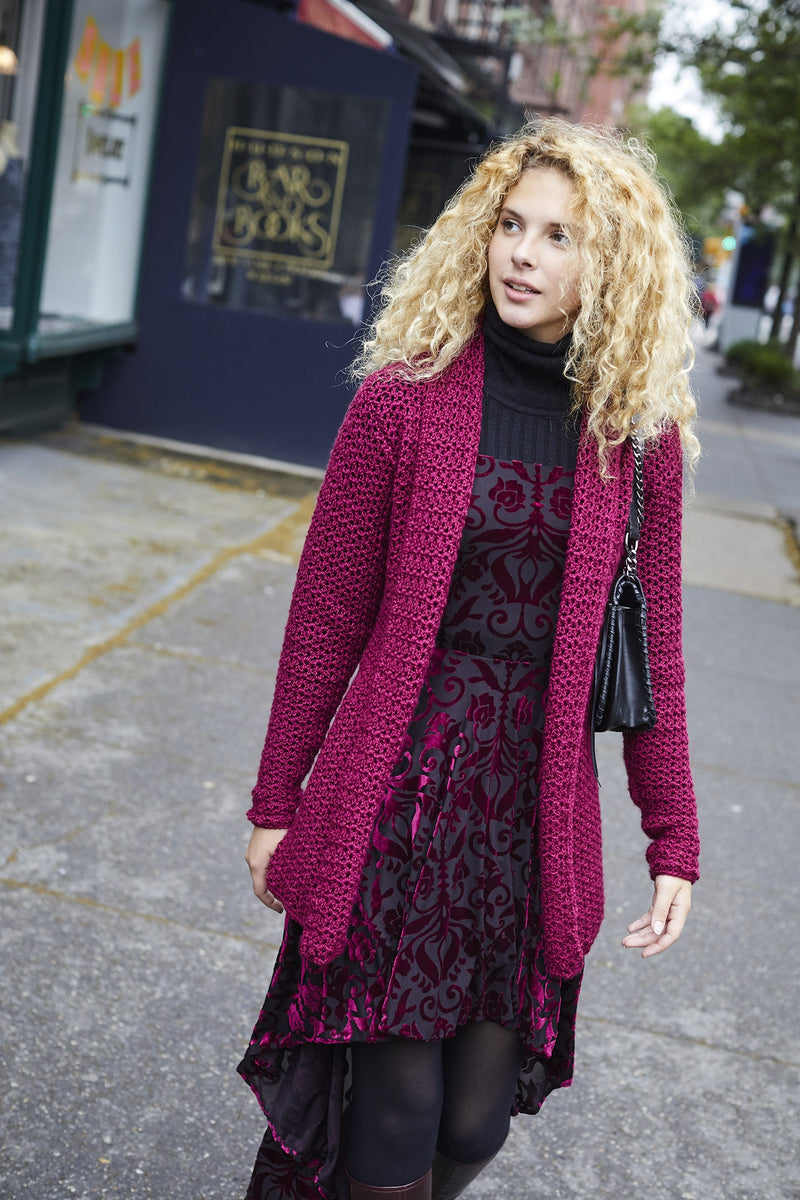 The Cranford Cardigan is a crochet cardigan pattern made with light weight yarn that has a skill level of easy.
