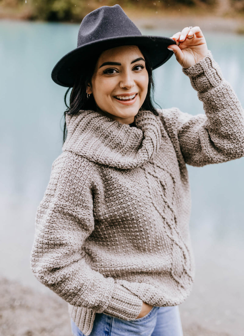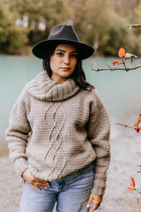 The Aelia Cable Crochet Sweater, made with Lion Brand Wool Ease, features beautifully textured cables that create a warm, chunky look, perfect for colder seasons. The relaxed cowl neck adds an extra layer of comfort and sophistication, draping loosely around the neck for a flattering fit. Perfect for cool weather, this handmade piece blends comfort with a classic, timeless appeal.