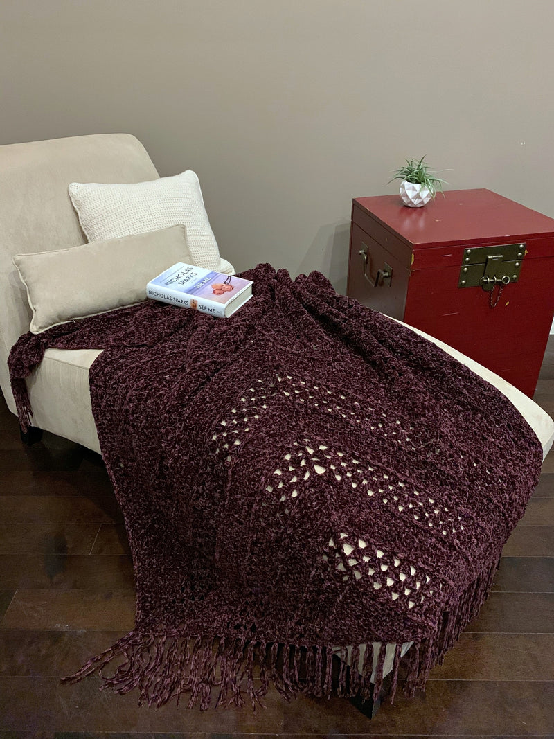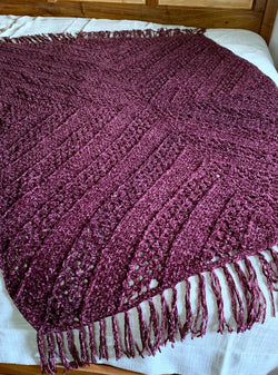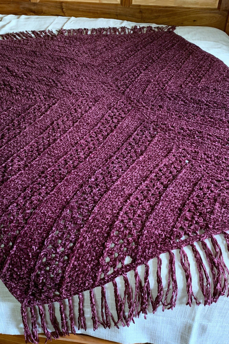 The Aubergine Afghan is crocheted with the luxurious Veluxe, velvet yarn. This modern crochet afghan is constructed with only 4 larger rectangles and is a perfect project for those evenings where you just want to relax and watch your favorite television show. It’ll quickly become your favorite cozy afghan to cuddle up in this winter. It’s also perfect for gift giving!