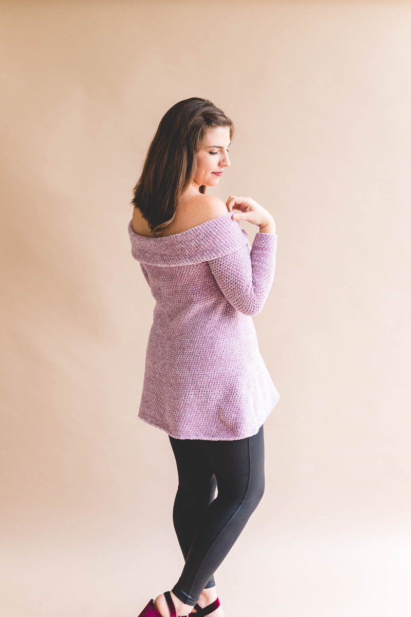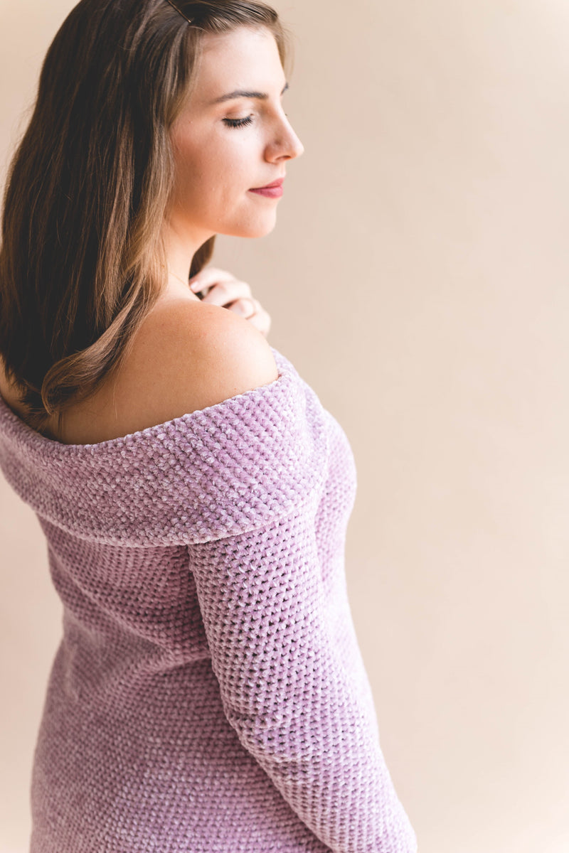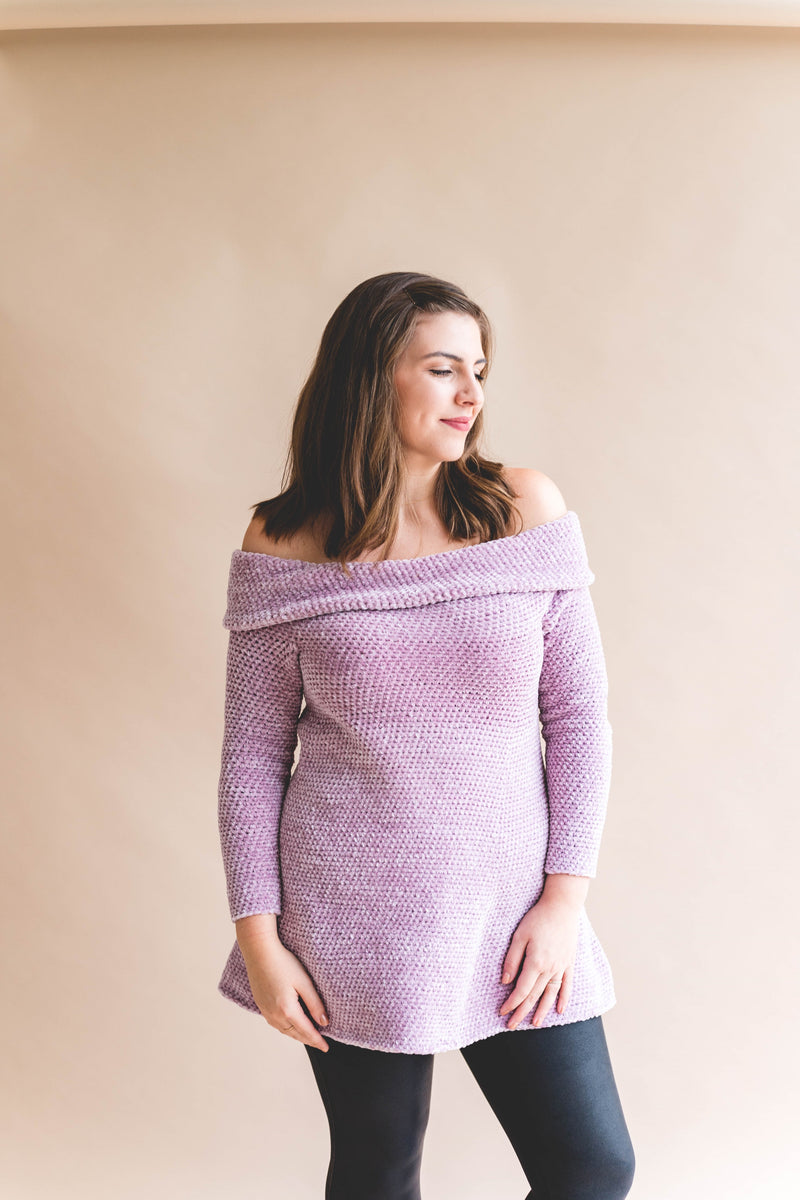The Audrey Tunic is a fit and flare off-the-shoulder top that's ultra-feminine and flirty. In true Sewrella fashion, this tunic was inspired by a retro look, that of Audrey Hepburn in Roman Holiday. Taking a dramatic neckline and fitted bodice to modern day with a "just-right" length that covers the tush and flares in a flattering A-line. This design is comprised of simple single crochets that work up in Lion Brand's Vel-Luxe yarn to create a truly stunning result - people will wonder how you made it yourself!