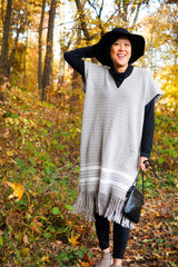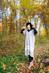 Cool yet cozy and comfortable, the Aurora Caftan is a great layering piece for cooler weather. It features playful fringe, chain details on the back, and simple white stripes that show a more complex star pattern upon closer inspection. Pair this with tights and a pair of boots for a perfect fall outfit!