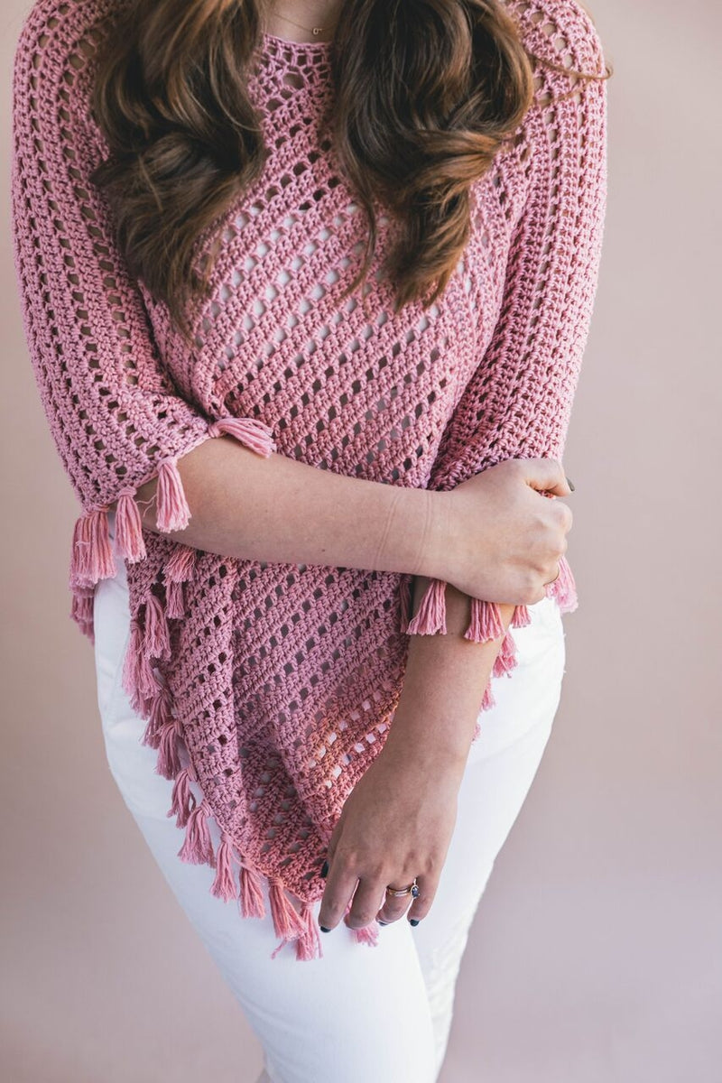 The Ava Fringed Poncho is the perfect topper to any outfit. It's lightweight enough to keep you breezy in the warmer months, and a wonderful layering piece over sweaters when it gets chilly outside. The easier than ever 2 rectangle construction means even a brand new crocheter can make it & the unique assembly style is a fun surprise!
