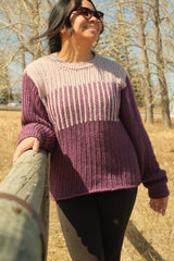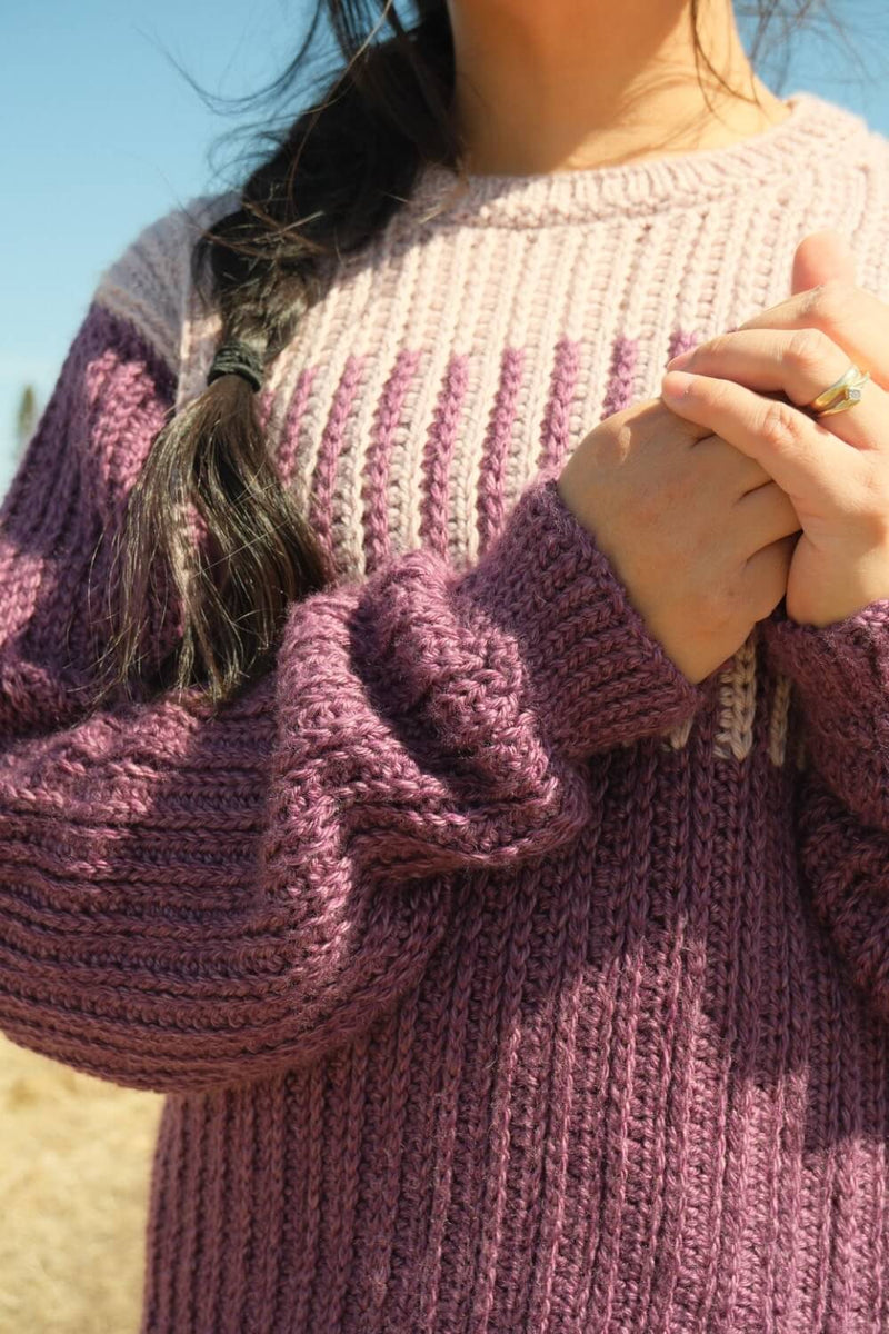 The Berber Pullover is a slightly oversized sweater with approximately 4” positive ease fit and uses a side-side construction on both the body and sleeves. The pullover is made using a knit look stitch and features a duo color yarn combination with a striped design in the upper mid portion creating a transition between the bottom of the garment (primary color) and the top of the garment (secondary color).