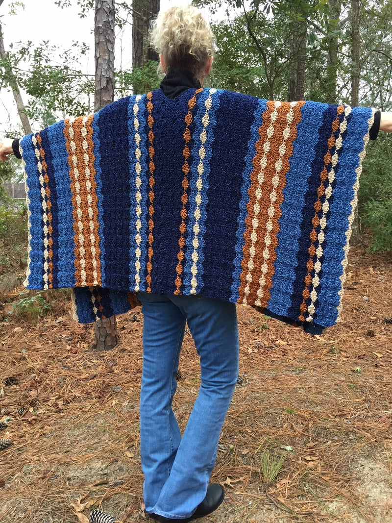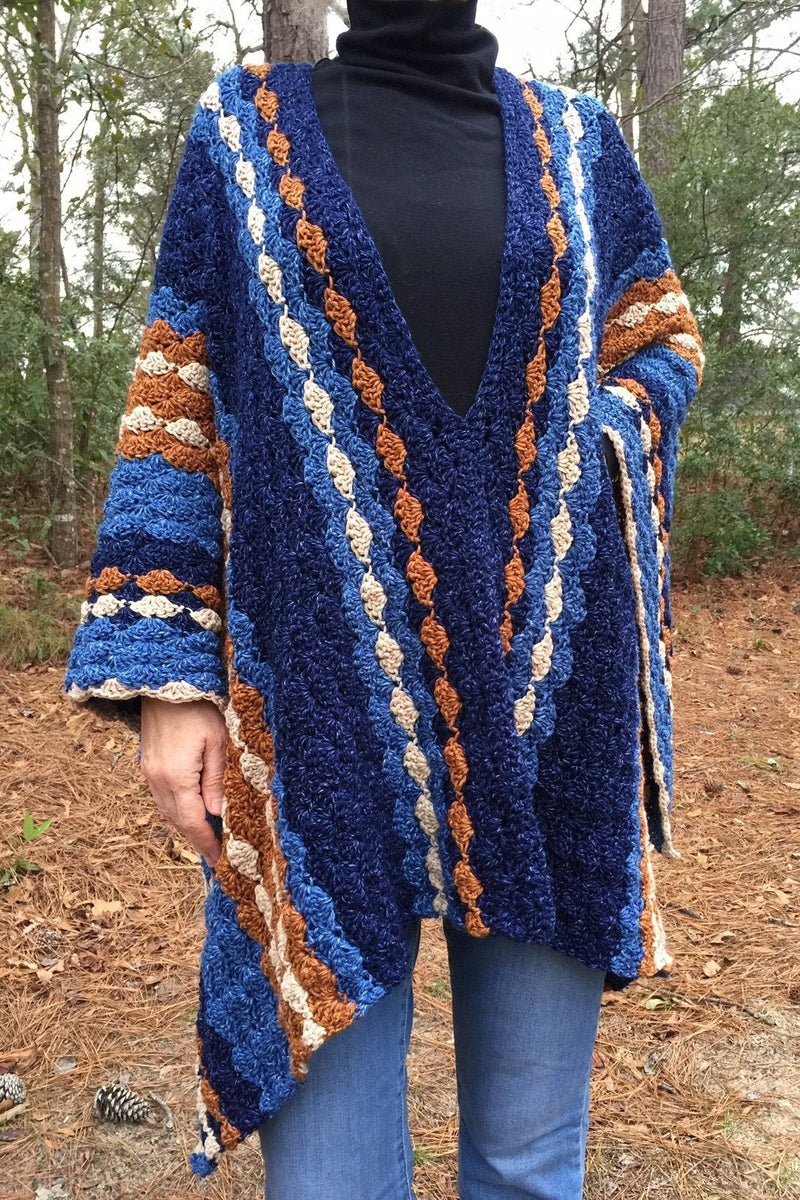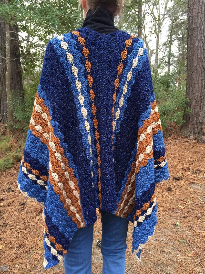 The colors and the drape of this poncho are fabulous!! It’s perfect with jeans and boots on those days when you need a little extra warmth but just want to be comfortable. Plus, it’s nice and long so you get plenty of coverage while staying super stylish! I wanted a vintage look, and the shell stitch achieves that perfectly. It’s a beautiful stitch and an easy repeat so it’s very relaxing to crochet.