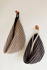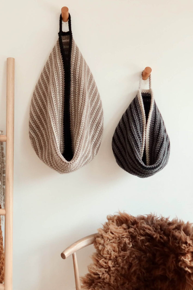 Store your goods in style with these versatile crochet baskets! Hang them folded on the wall for chic vertical storage or stuff them to the brim with them fully opened on the floor. With playful striping and a sturdy but relaxed fabric, they look effortlessly cool and can be color customized to suit your interior style.
