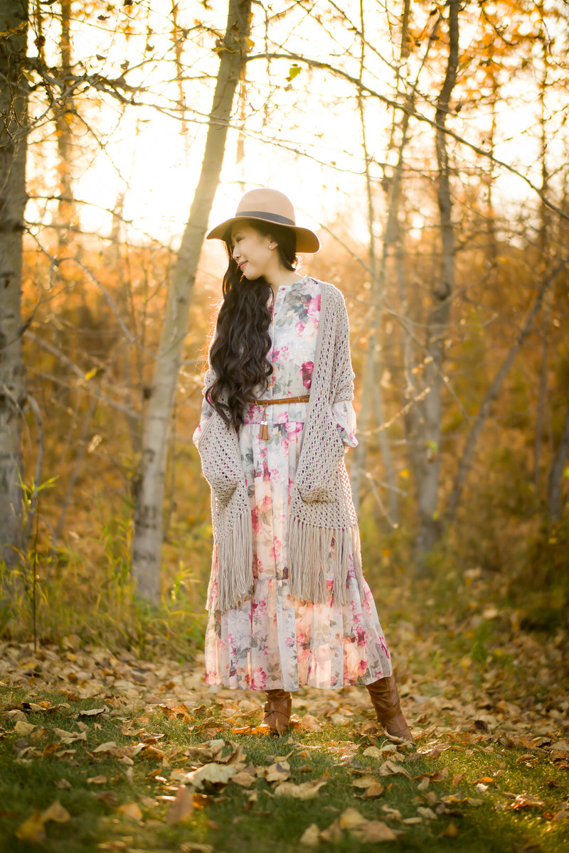 Crochet this romantic shawl using the elegant bobble trellis stitch! The cozy pockets and luxurious fringe will make this shawl your new favorite using superwash merino yarn!