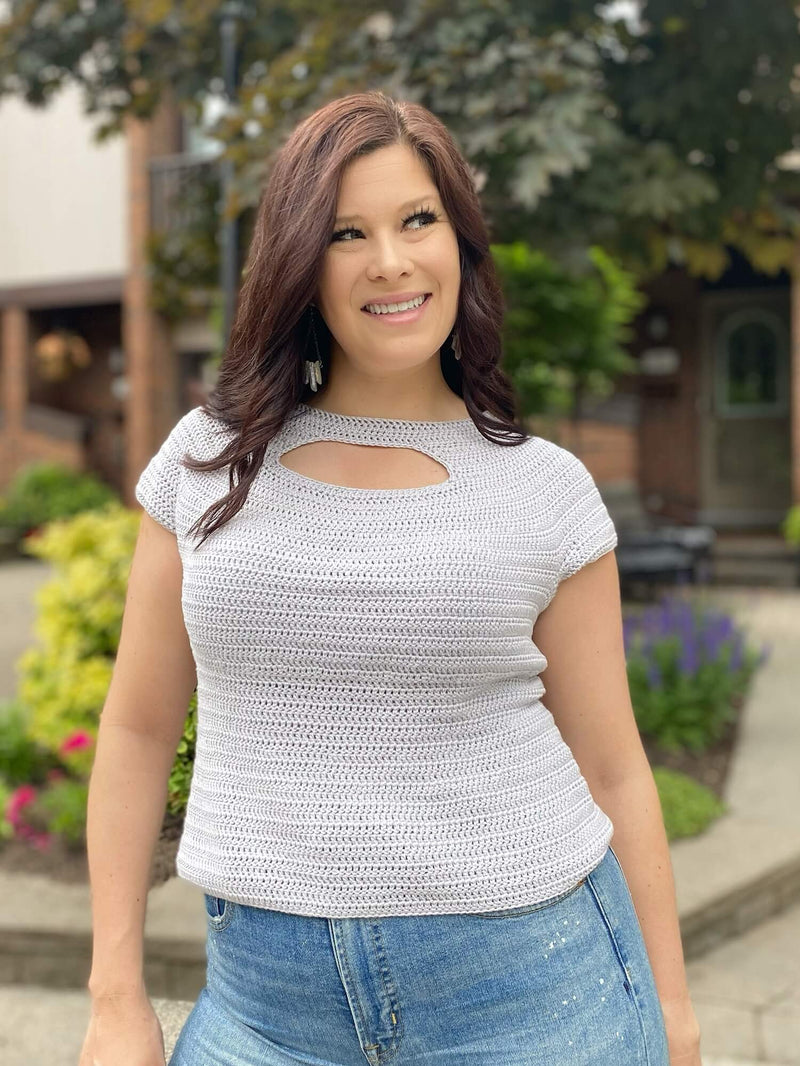 The Cap Cut Tee is a simple tee with a fun arched cutout detail on your chest that you are going to love dressing up or down! Worked in Lion Brand Truboo, it is soft and slinky, and will highlight your gorgeous shape. The tee is primarily done in dc, so it will work up fast and you’ll be adding this summer staple to your closet in no time!