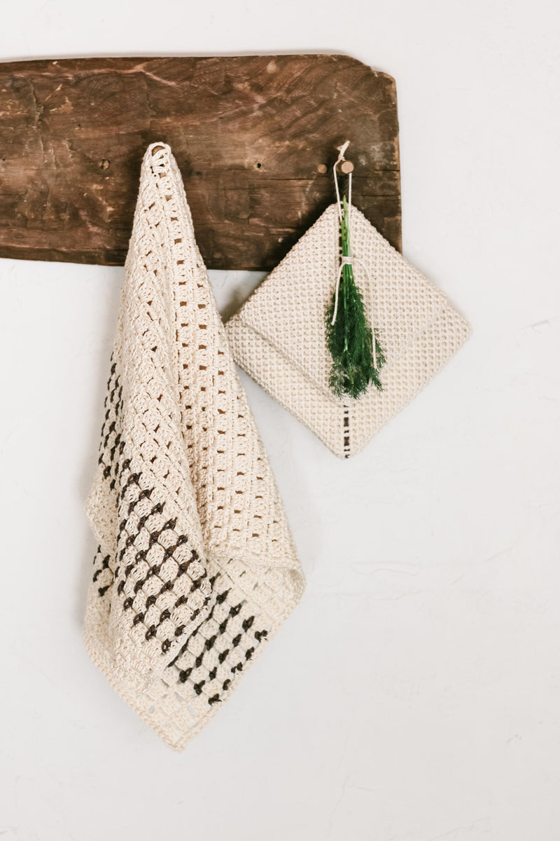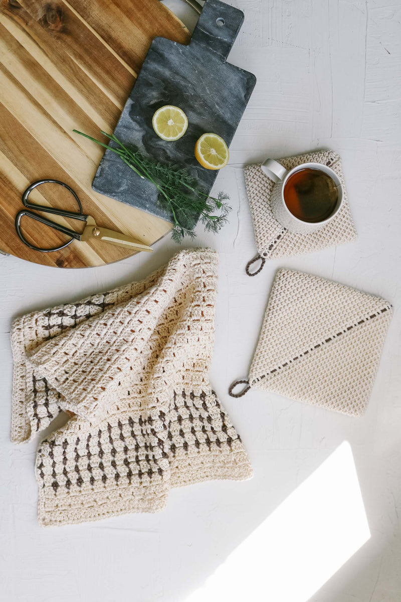 Simple to crochet, satisfying to use and gift. The Casita Kitchen Set uses basic stitches and creative techniques to create a classic farmhouse look without extra ends to weave in. With a quaint yet contemporary feel, this crochet tea towel and set of two double thick protective potholders will add an enduring handmade touch to your home.