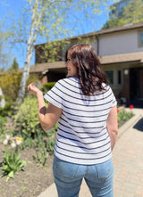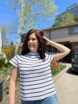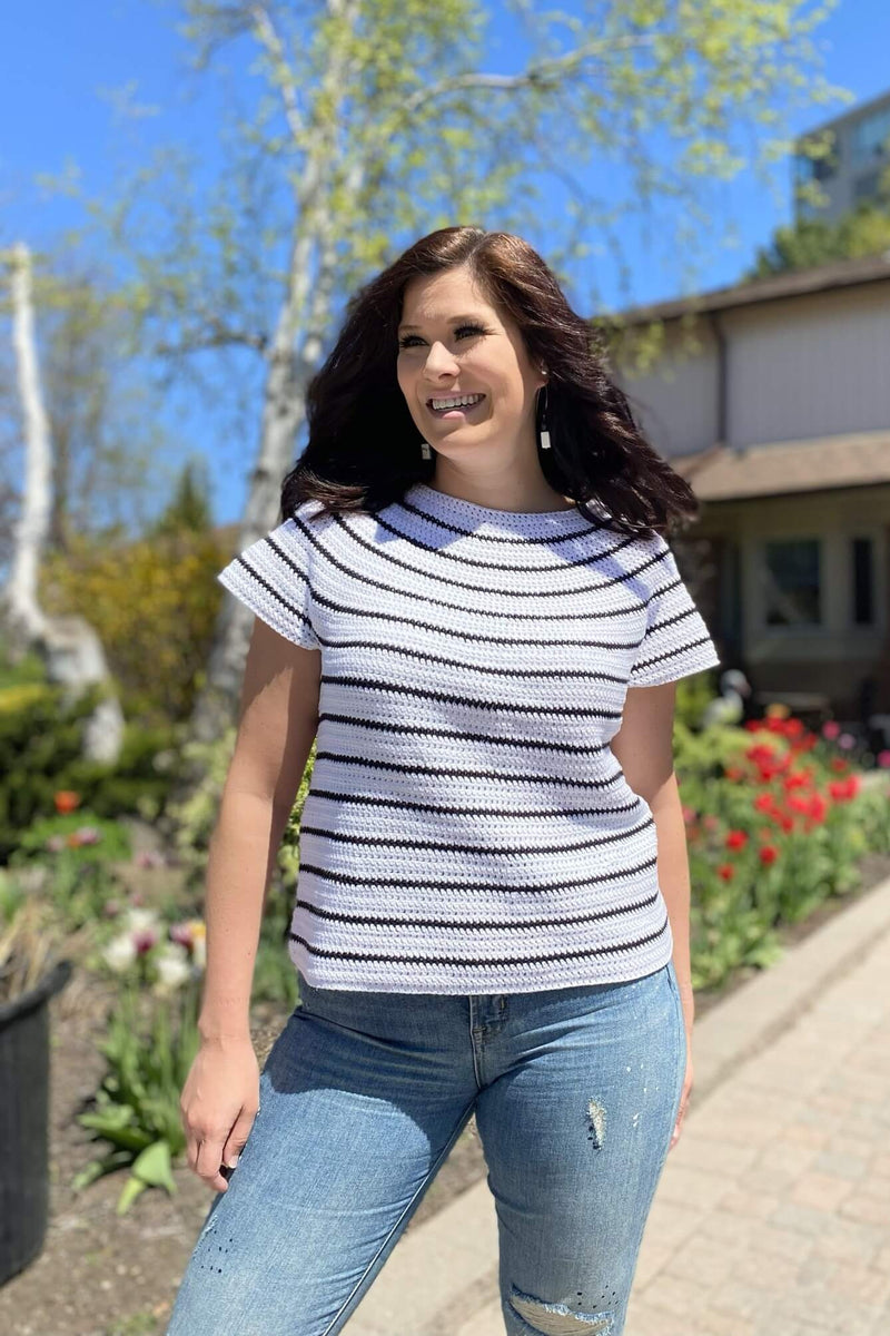 The Catalina Tee is a spring and summer staple that is a must have in your closet. Designed top down and in the round, you can try it on as you go to ensure the perfect comfy fit. She has 2-4” of ease and is designed with Coboo, the perfect cotton bamboo blend, allowing you to wear it no matter the weather. The simple slim stripes provide fun visual interest while still being very simple to work up!