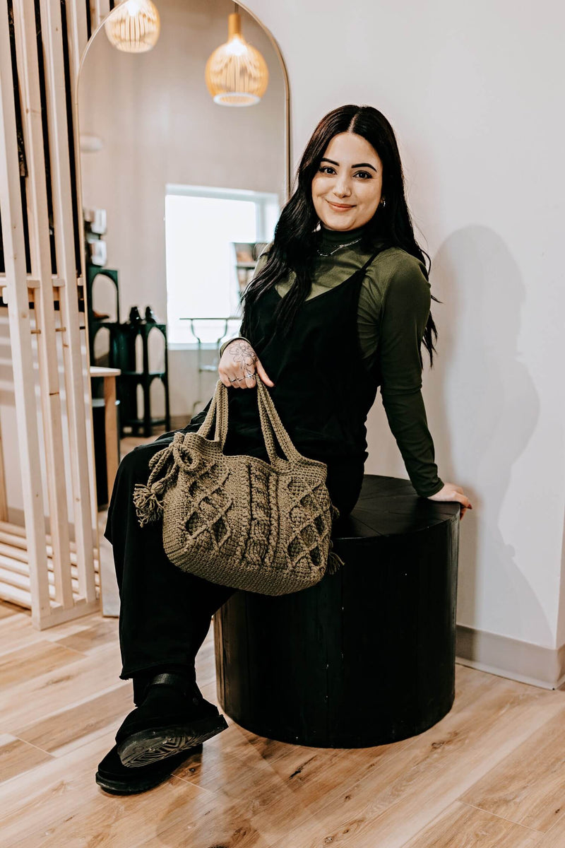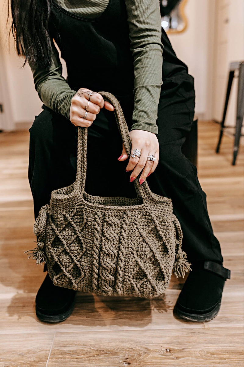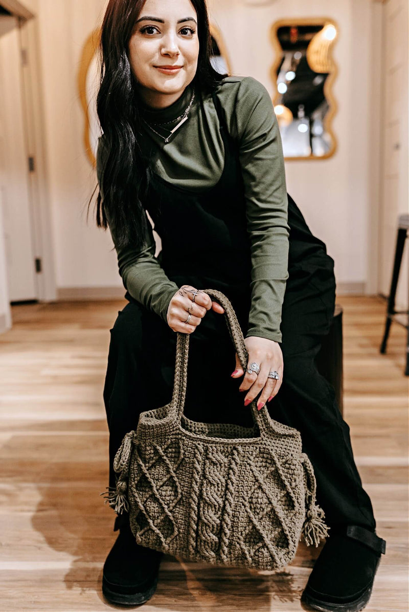 The Charlene Cabled Purse is a stylish and textured accessory featuring cable stitch patterns that mimic traditional knitted cables. This bag is crocheted with two strands of yarn for durability. Perfect for everyday use, this cabled crochet purse adds a touch of handmade charm to any outfit. Pattern includes instructions for two strap options: yarn straps, or store bought straps.