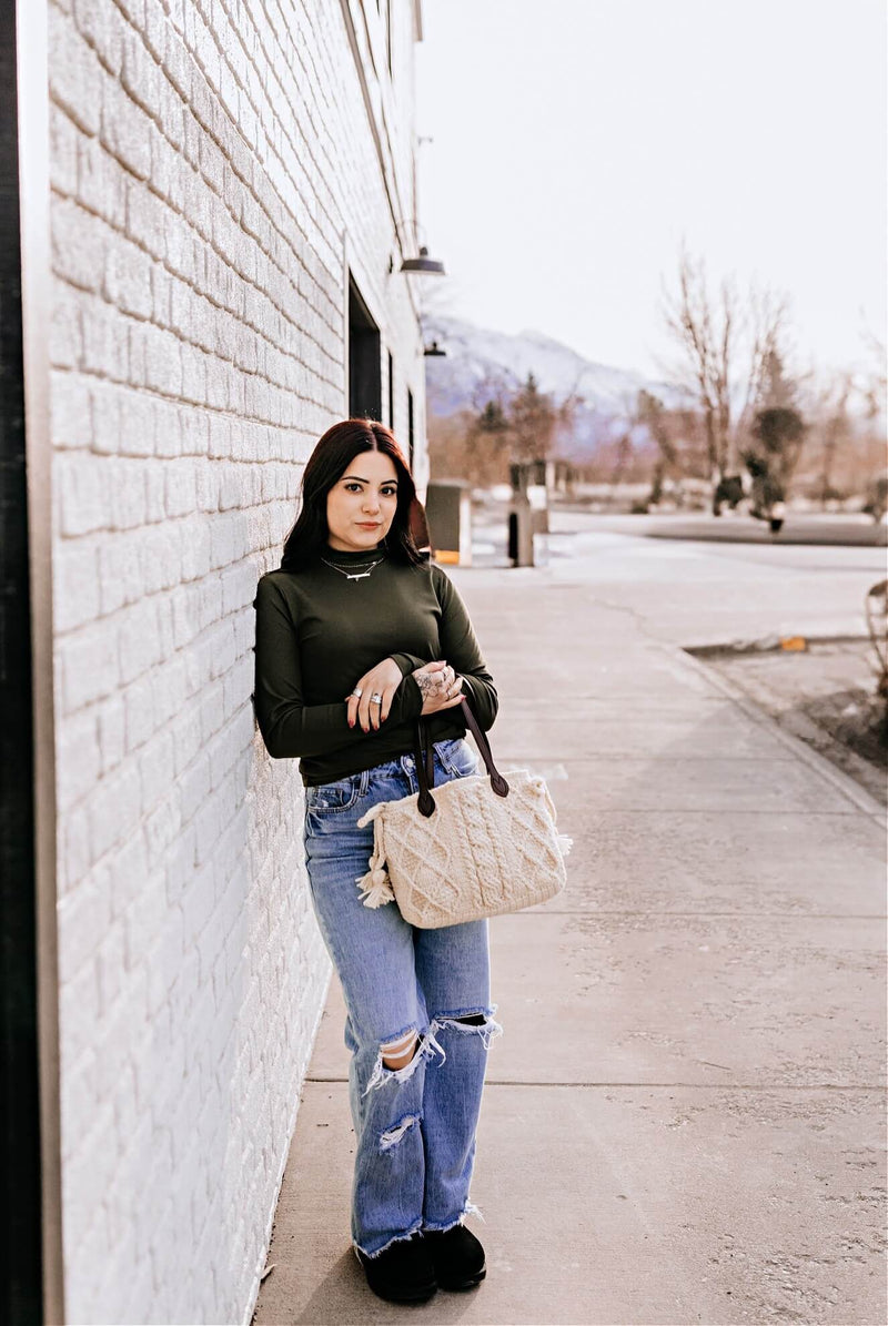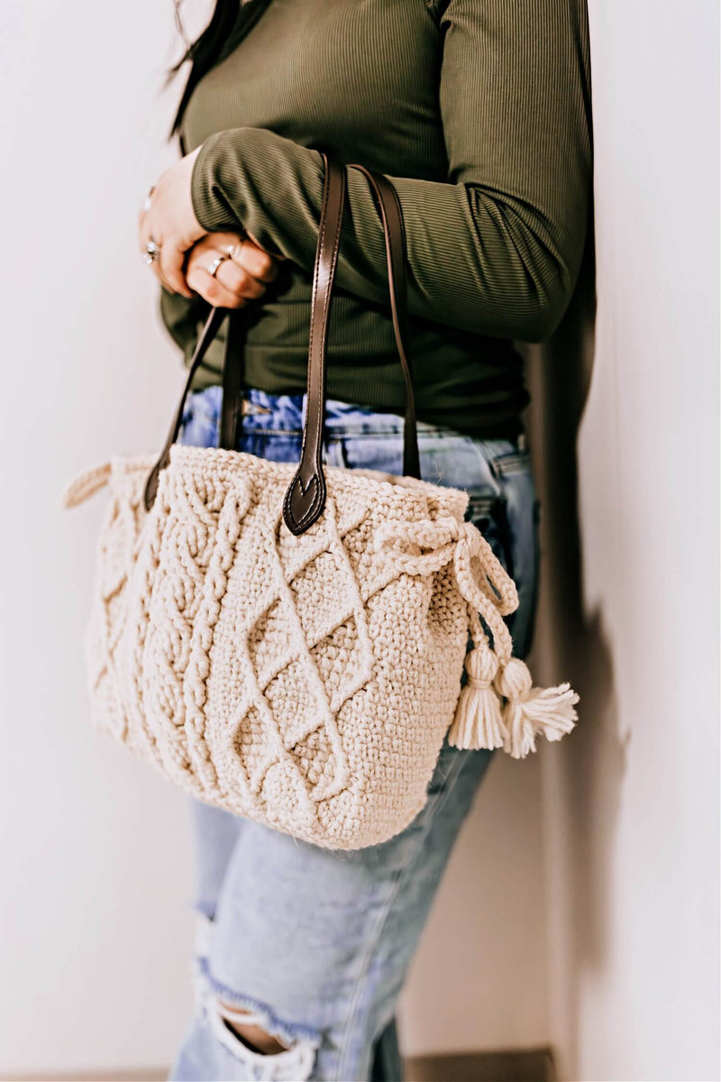 The Charlene Cabled Purse is a stylish and textured accessory featuring cable stitch patterns that mimic traditional knitted cables. This bag is crocheted with two strands of yarn for durability. Perfect for everyday use, this cabled crochet purse adds a touch of handmade charm to any outfit. Pattern includes instructions for two strap options: yarn straps, or store bought straps.