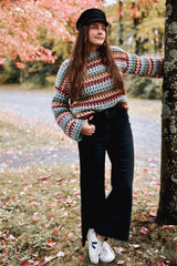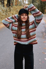 Inspired by my favorite character from The Babysitter’s Club, this funky multi-color pullover is definitely a statement piece. The open grid-like construction keeps this crochet sweater airy and drapey while the bulky weight yarn makes it a quick and easy project.