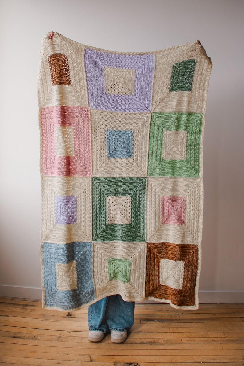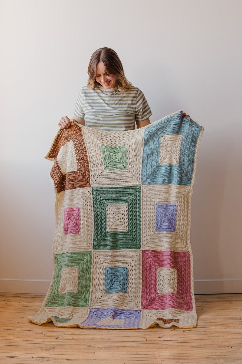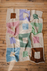 Finished blanket measures approximately 43.5” (110 cm) wide and 57.5” (146 cm) long, blocked.