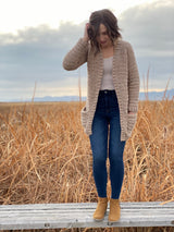 The Coffeeshop Cardigan was inspired by all things cozy. It’s the perfect housecoat to throw on over leggings and an oversized tee. The homespun yarn gives it the perfect amount of rustic handmade feel. The pattern uses half double crochet throughout for easy stitching.