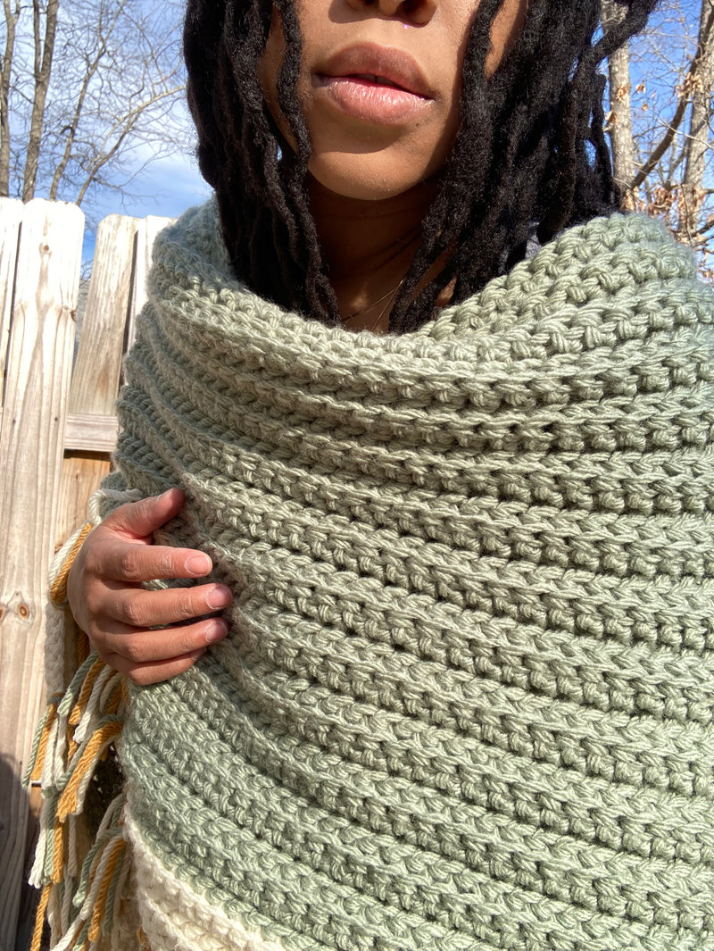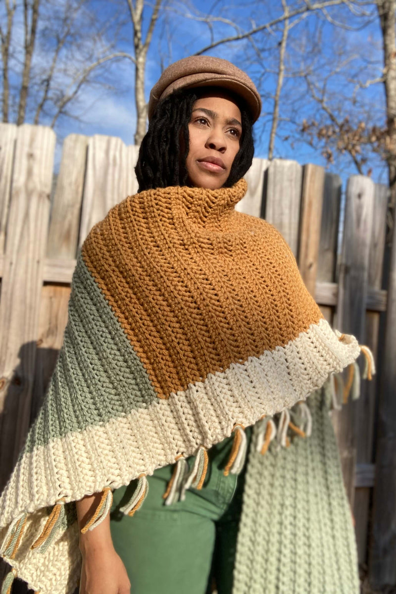 The Crochet Collective Wrap was reimagined from its knit sister, the Switch Wrap. This wrap was designed to give crocheters the ultimate statement winter wardrobe accessory. Wear as a wrap, poncho, or ruana.