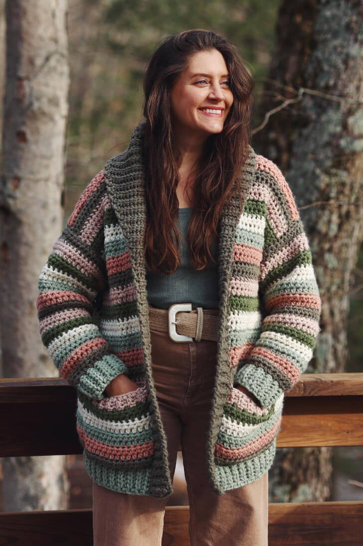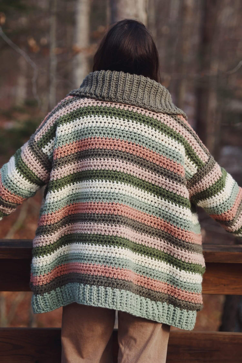 Cozy up to this colorful cardi with the ultimate comfy details like an oversized shawl collar, shaped shoulders, and chunky deep pockets. Crocheted with an extra large hook, the fabric is squishy and forgiving despite the bulky weight.