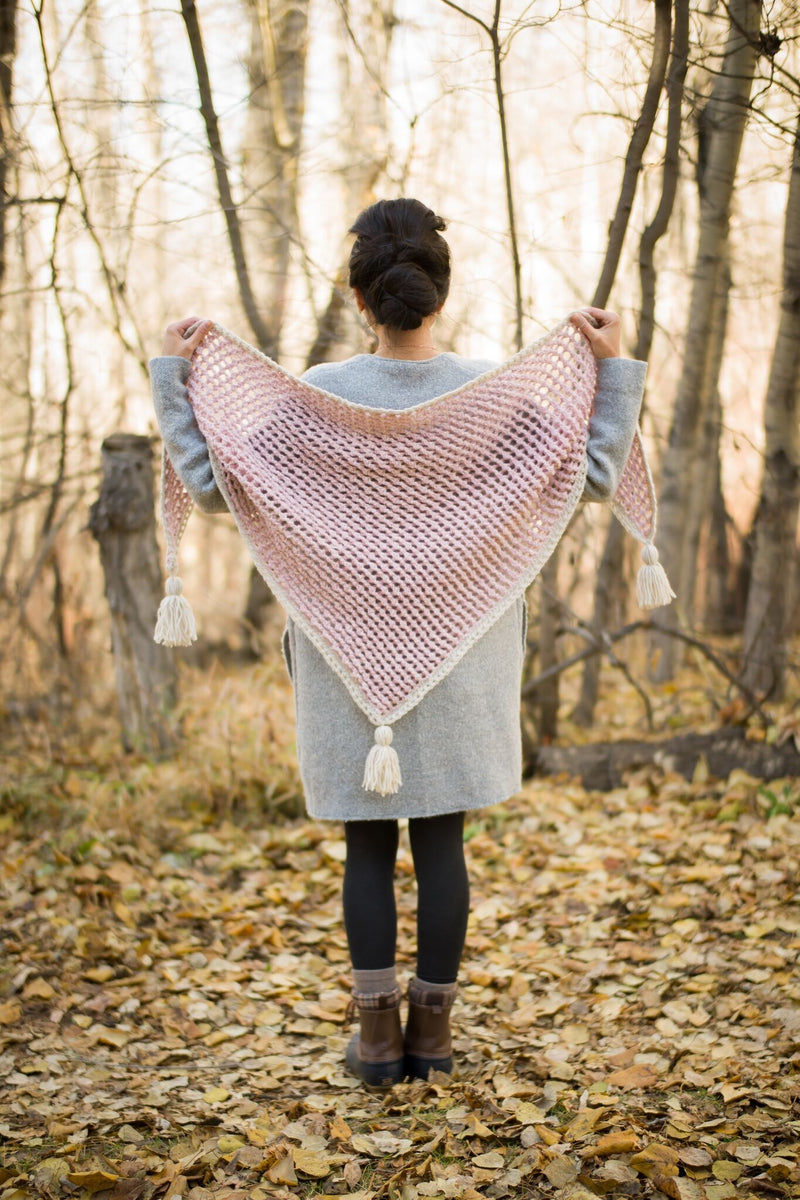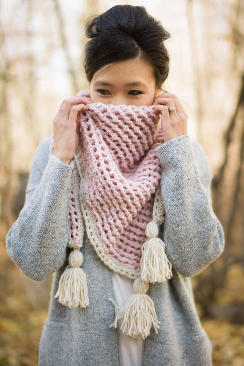 Crochet this luxurious Crosswinds Triangle Scarf using special stitches to create this gorgeous texture! The triangle is crocheted in the Main Color and a Contrast Color is used for the decorative edging and the tassels. This triangle scarf immediately elevates any fall and winter outfit and is easy to wear as you wrap it around the neck without needing to pull it over your head (no messing up hairstyles)! The Main Color and Contrast Color complement each other to make a beautiful color combination with this wool blend yarn that will keep you warm and is easily washable. Optional tassel and fringe can be added to this stunning scarf!