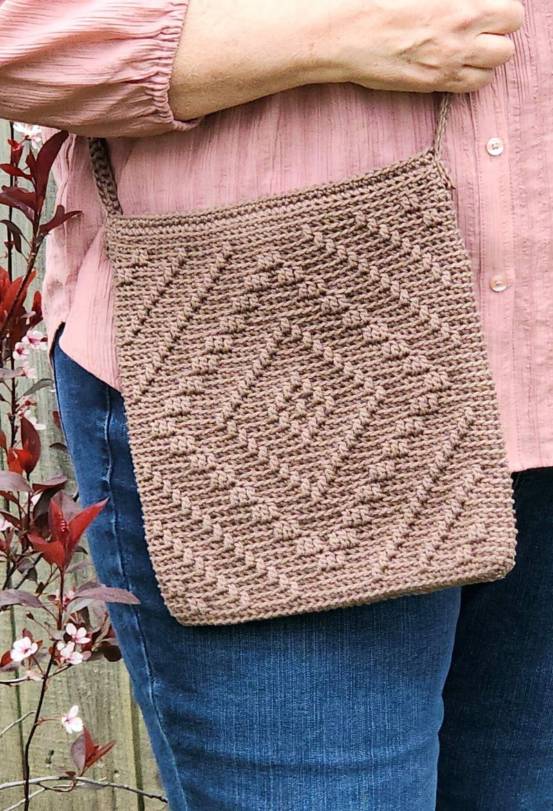 The Diamond Peaks Crossbody Bag is perfect for all your everyday adventures! It’s crocheted with sturdy mercerized cotton yarn and features a raised diamond design done in an easy overlay technique using single crochet and double crochet.