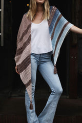 Designed as a fresh take on the ever-popular “Tea House Wrap,” the Earl Grey Wrap has a similar uneven striping broken up with simple lacework, but with a slightly asymmetric shape. A side-to-side construction highlights the painterly self-striping Mandala yarn and allows it to shine.