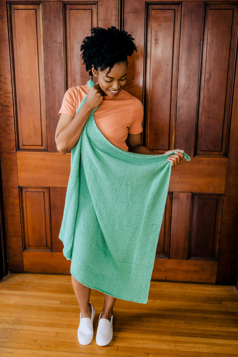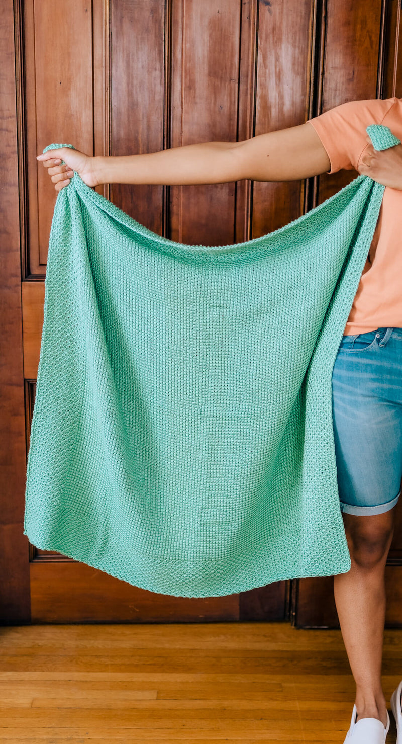 Simple doesn’t have to be boring, especially when you make the Elmore Blanket. This Tunisian crochet stunner has a simple stitch body with a built-in honeycomb stitch border. Worked up in silky 100% bamboo yarn, this beautiful unisex blanket will surely help you win the baby shower.