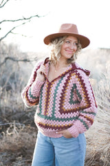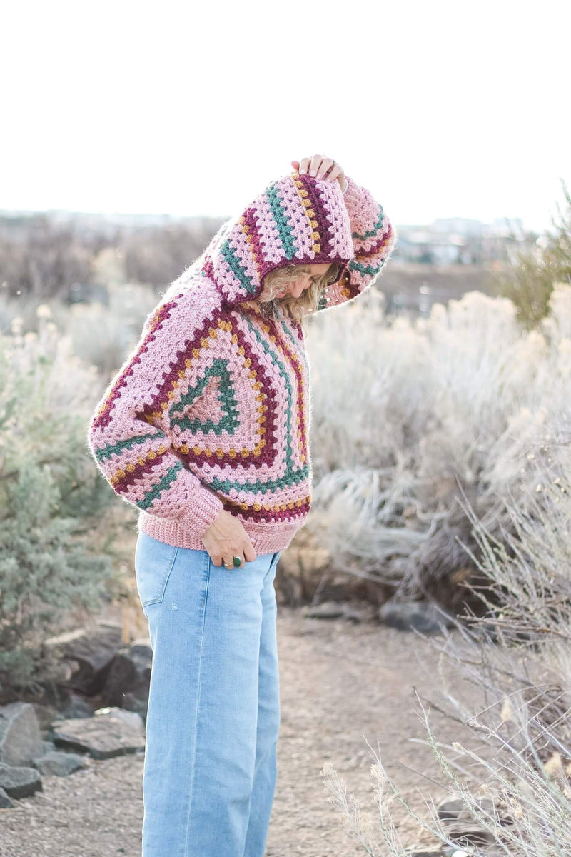 Can you believe a couple of simple granny hexagons are the foundation of this comfy hoodie? After working two meditative hexagons, you’ll fold them into the sleeves and chest of your sweater. Easily customize for your specific body using the suggestions included in the pattern.