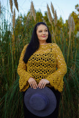 This top-down sweater is elevated with a delicate lace stitch that is worked throughout the entire design. With the option for big bell sleeves or a puffy cuff sleeves, you can truly make this design your own, adding a feminine, romantic touch to any ensemble!