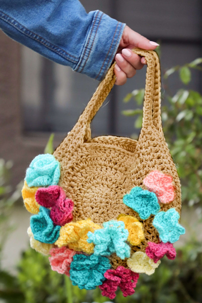 A vibrant and whimsical bag to add to any summer outfit! An overflowing basket full of flowers but its even better because it’s out of yarn! This works up quick and the flowers are so simple to make!