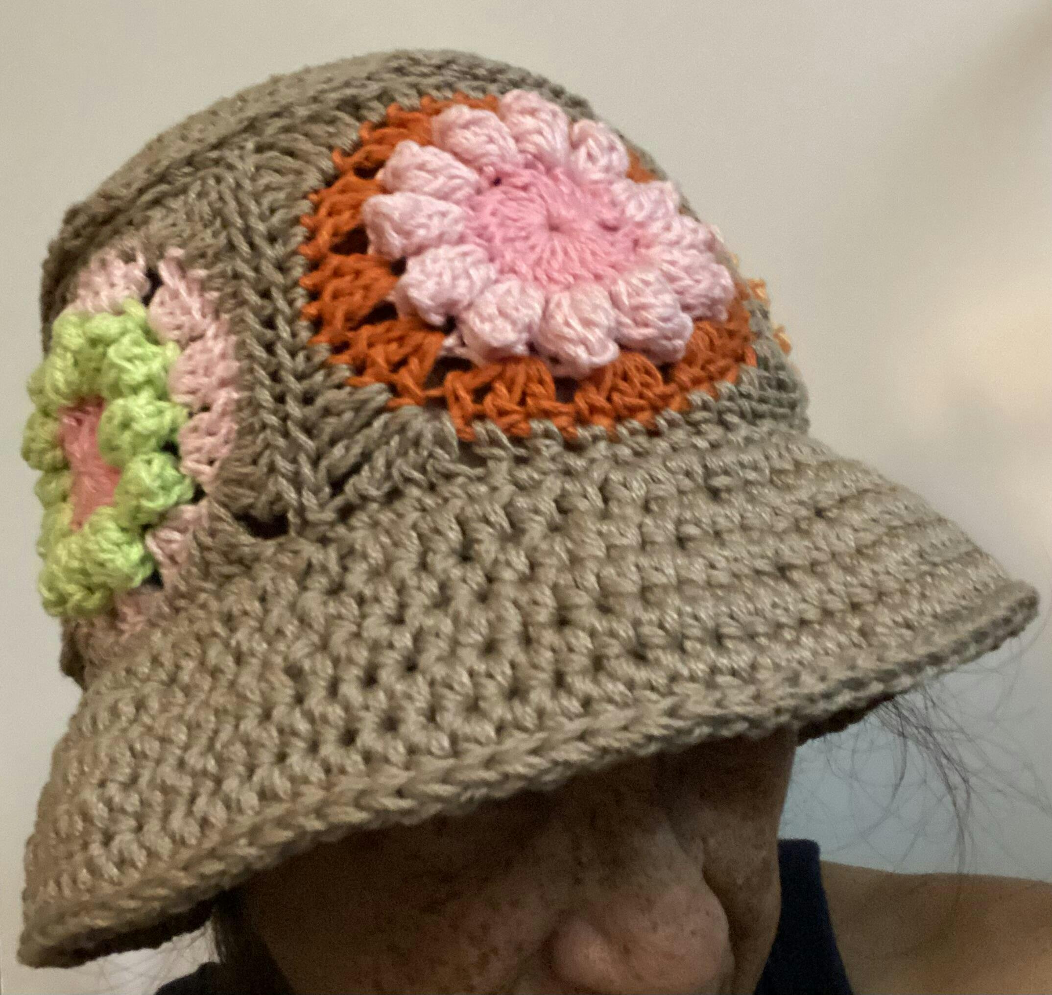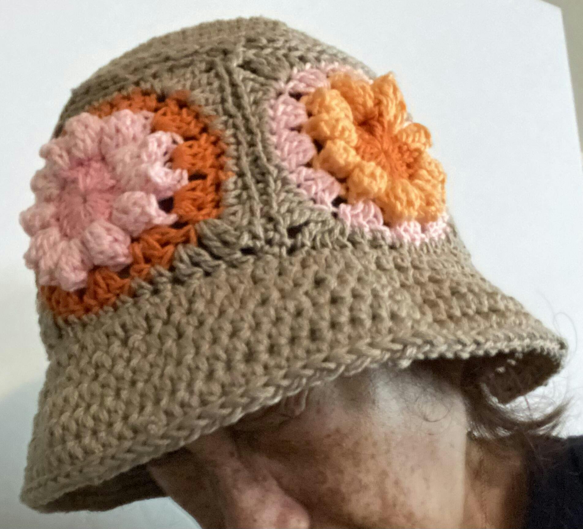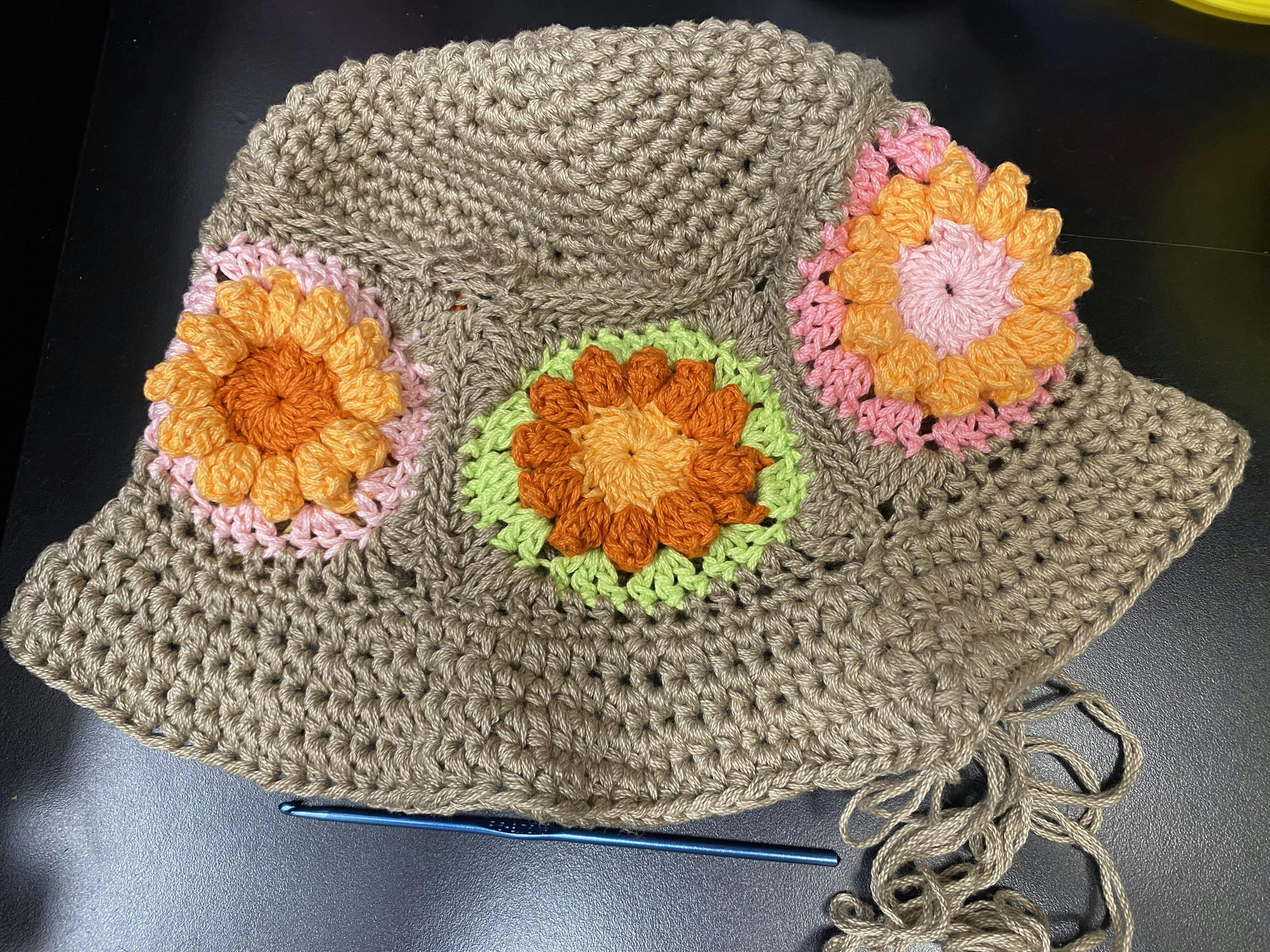 New to crochet, self taught, instructions easy to understand. I used a size F hook to get the proper gauge and needed only 5 granny squares, 6 granny squares made the bucket hat too big for my head. I used a different stitch to attach the granny squares and the crown. Also, used hdc stitch for brim. For a beginner in crochet, I love how the bucket hat turned out and fit is great!