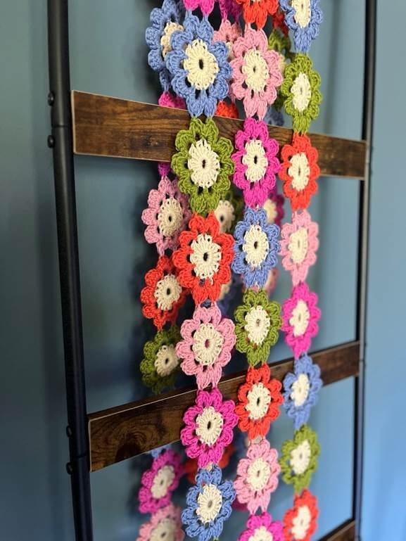When I first set out to design a crochet flower scarf, I knew that I wanted to use a cotton blend with a bit of sheen. Lion Brand LB Collection Cotton Bamboo is the perfect yarn for this project because of its softness and touch of shine. The repetitive nature of this project means you can pick it up and put it down easily without losing your place. And the best part? No seaming!
