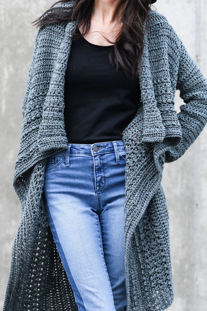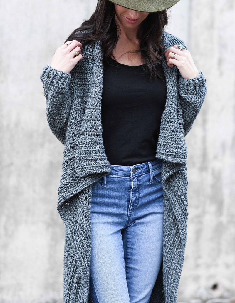 This unique, boho-inspired sweater is just as comfy as it is cute. You’ll love how soft it is on the skin and how easy it is to crochet! Featuring a flowing collar, textured stitches and a lengthy fit, this cardigan compliments leggings and jeans alike.